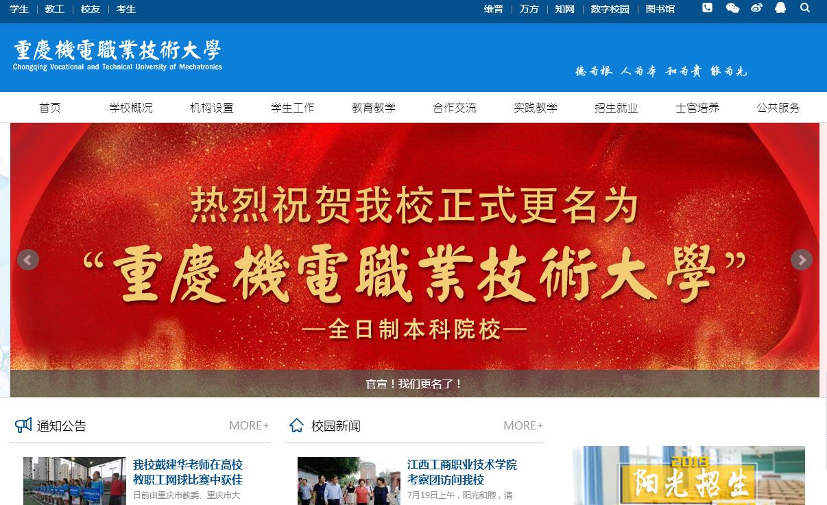 重庆机电职业技术大学(学校标识码:4150012607)始建于1971年,前身是重庆兵器工业职工大学,由长安、江陵、嘉陵、建设、长江、望江、西车、泸化等八所职大组成。2003年在重庆兵工职大的基础上成立全日制普通高等院校。2018年10月12日,教育部确定我校为全国首批本科层次职业学校改革试点单位,2018年12月19日,教育部致函重庆市人民政府《关于同意重庆机电职业技术学院升格为本科层次职业学校的函》(教发函﹝2018﹞166号),正式同意我校升格为本科层次职业学校,学校发展迈向了更高平台。2019年5月27日,教育部正式下文(教发函〔2019〕36号),批准更名为重庆机电职业技术大学,从2019年起即可面向全国招收本科学生。首批本科专业有:机械设计制造及其自动化、材料成型及控制工程、车辆工程、电气工程及其自动化、物联网工程、智能制造工程、大数据技术与应用、汽车服务工程、工程造价、物流管理等10个职业本科专业。学校是重庆市骨干高职院校,先后荣获“全国十大特色学校”“全国职业院校就业百强”“全国双创示范单位”“全国校企合作先进单位”称号,被教育部授予“国防教育先进单位”,是重庆市首个中国人民解放军定向培养士官高校。学校占地904亩,建筑面积26万平方米。校园规划合理,依山而建,环境优雅,风景秀丽,建筑气势恢宏,教学设施完备,实训中心规模宏大,学生宿舍、体育场所、生活服务中心一应俱全,是宜居宜行宜学的优质校园。学校实验实训中心下设机械工程中心、中德汽车工程中心、智能制造工程中心、产教融合协同创新中心、虚拟仿真教学实训中心,建有中央财政支持实训基地3个,校内外实习、实训基地125个,其中校外顶岗实习基地66个,馆藏图书近69.6万册。学校现有专任教师477人,生师比为17.36:1。专任教师中,具有副高级及以上专业技术职称教师186人,占专任教师的38.9%;具有研究生学位专任教师178人,占专任教师的37.3%;“双师型”教师253人,占专任教师的53%。有机械工程学院、汽车工程学院、电气与电子工程学院、信息工程学院、建筑工程学院、工商管理学院、国际艺术学院、通识教育学院、士官生学院、健康与国际教育学院、继续教育学院、马克思主义学院。设有机械制造、数控技术、机电一体化、汽车装配技术、建筑工程、会计与审计、艺术设计、家政等37个专业。学校坚持“德为根,人为本,和为贵,能为先”的办学指导思想,着力打造“兵工技师”“重庆技师”品牌,坚持“过硬的技能、良好的习惯、健康的心态、创新的意识”的人才培养要求,建设和谐校园、希望校园、进步校园、美丽校园,办人民满意的高职院校。近年来,学生在省部级及以上的各类技能竞赛中获奖148项,其中获国家级一等奖3项、二等奖13项、三等奖22项;省部级一等奖16项、二等奖23项、三等奖51项。代表中国高职院校赴新加坡参加“第九届(新加坡)国际市场营销大赛”获最佳创意奖;在全国大学生电子设计竞赛中荣获一等奖;在全国“挑战杯”创新创效创业大赛中获一二三等奖各一个;在全国职业院校技能大赛中荣获“机械部件创新设计与制造”二等奖。学校通过“校企合作、工学结合”等多种方式,陆续与200多家企业建立合作关系,先后与红宇工业、青山工业、蒂森克虏伯、东风小康、龙湖集团等企业签订校企合作培养协议,开展“合作班”“订单班”“试点班”等有针对性的培养,以强大的就业基地为基础构建多元化的就业渠道,以健全的职业规划指导与完善的就业服务,为学生就业搭建畅通渠道,同时为学生未来发展提供广阔空间。近五年,学校毕业生就业率连续保持在98%以上。学校的综合实力不断提高, 学校的声誉和社会影响不断扩大。市委、市政府、市教委主要领导都曾亲临我校考察指导,对学校的办学思想和建设发展给予了充分肯定。进入新时代,全校师生将深入贯彻习近平新时代中国特色社会主义思想,秉承“在这里,只有我们,没有我”的校训,抓住职业教育发展的重要战略机遇期,始终坚持教学质量优先,坚持服务地方经济建设优先,进一步凝练办学理念,突出办学特色,保持职业教育属性,坚持质量为本、特色立校,面向市场,融入企业,以服务求支持,以贡献求发展,在服务中壮大自己的办学方针,为构建健康和谐的育人环境和协调向上的发展格局,为培养高层次技术技能人才而奋斗。