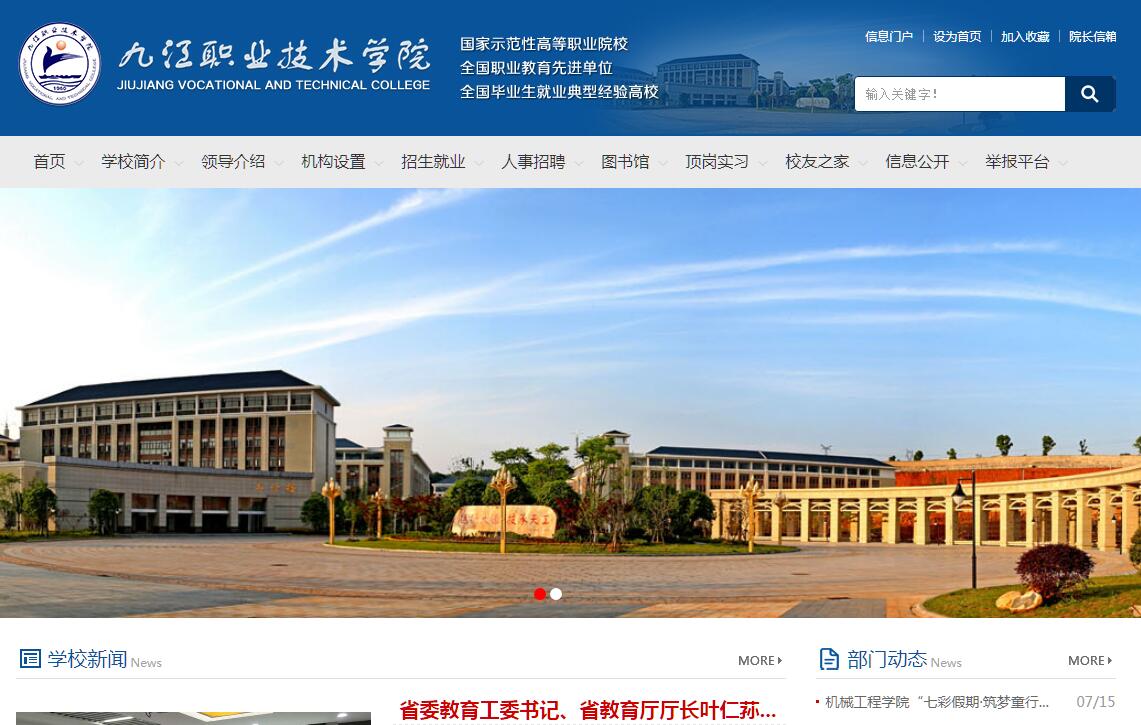 九江职业技术学院是经过教育部批准成立的全日制普通高等学校,是江西省唯一一所国家示范性高职院校。学校创办于1960年,前身为九江船舶工业学校,先后隶属第一、第三、第六机械工业部、中国船舶工业总公司。1999年3月,学校由国防科工委划转至江西省人民政府管理,是江西省教育厅直属高职院校,全国首批举办高等职业教育的10所学校之一。学校坚持“质量立校、特色兴校”的办学理念,秉承“德行大道,技承天工”的校训,弘扬“船舶军工特色”的校园文化,明确“立足江西、面向全国,培养高素质技术技能人才,服务船舶军工行业和江西经济社会发展”的办学定位。经过近60年的发展历程,办学水平和社会影响力显著提高。2010年,通过教育部、财政部“国家示范性高等职业院校建设项目”验收,成为江西省唯一一所跨入全国100所国家示范性高职院校行列的高职院校。2014年,开始联合培养应用技术型本科人才,正式揭开了应用型本科人才培养的新篇章。2016年,被列为江西省“国家优质专科高等职业院校建设立项单位”。学校先后被评为“国防科技工业职业教育实训基地”“中央与地方共建高校特色优势学科实验室院校”“全国职业教育先进单位”“全国机械行业骨干职业院校”“全国毕业生就业典型经验高校”“教育部第一批教育信息化试点优秀单位”“全国高职院校教学资源50强”“全国职业院校实习管理50强”“全国五四红旗团委”“第一届江西省文明校园”,学校连续十届被省委、省政府授予“江西省文明单位”称号。学校建有濂溪、十里两个校区,占地面积1400余亩,全日制在校生18000余人,设有8个二级学院、4个教学部门,共开设66个专业,形成了以先进制造、电子信息、船舶工程为主要特色,兼有建筑工程、经济管理等多门类协调发展的专业体系。拥有5个国家示范专业、2个教育部提升服务能力专业、2个全国机械行业创新专业、2个全国装备制造类示范专业点、8个国防军工特有专业、3个省级应用型本科试点专业、7个江西省高校特色专业、8个省级高职高专示范专业以及3个全国机械行业特色专业。学校拥有专任教师869名,国家级教学团队2个、省级教学团队4个,拥有享受国务院特殊津贴、全国职业教育先进个人、赣鄱英才555工程人选、省高校名师、省首席技师等87人。学校建有1个工业工程中心、1个生产型工程训练中心和197个专业实验实训室,教学、科研仪器设备总值逾2亿元。其中,拥有5个国家示范专业实训基地、3个中央职业教育实训基地、1个国家紧缺人才培养基地、15个中央与地方共建高校实验室、13个中央财政支持地方高校发展专项实训基地等一大批国家级省级优质实训基地,与中国船舶两大集团公司等200余家单位合作建立了稳定的校外实习实训基地和就业基地。学校坚持以立德树人为根本,以内涵建设为重点,以专业建设为龙头,不断深化教育教学改革,取得了丰硕成果。近年来,学校荣获高等教育及职业教育国家级教学成果二等奖4项、国家精品课程3门、国家精品资源共享课3门、国家级视频公开课1门,省级教学成果奖17项、省级人才培养模式创新试验区4个、省级精品课程31门、省级精品资源共享课21门,省级精品在线开放课程5门。学生在国家和省级各类专业技能大赛中共获奖项1015人次,其中国家级一等奖11人次、二等奖25人次,省级特等奖8人次、省级一等奖163人次; 教师参加教学竞赛共获奖67人次,其中国家级二等奖1人次、三等奖5人次,省级一等奖15人次、二等奖25人次。学校正朝着中国特色高水平高职院校目标迈进!