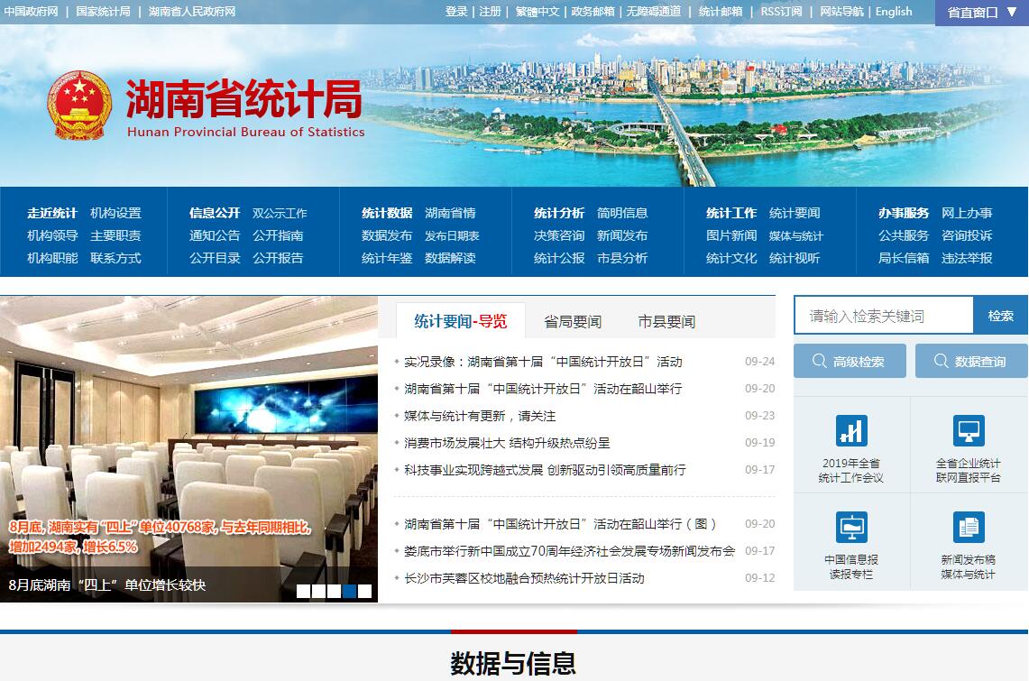 湖南省统计局是主管全省统计和国民经济核算工作的省人民政府直属机构。其主要职责是:(一)贯彻执行国家统计工作的方针、政策和统计法律法规,研究统计制度和统计方法的改革,完成国家和地方统计调查任务;承担组织领导和协调全省统计工作,确保统计数据真实、准确、及时;监督检查统计法律法规的实施情况,查处各类统计违法行为。(二)制定并组织实施全省统计改革和统计现代化建设规划及统计调查计划,建立健全国民经济核算体系和统计指标体系,拟订国民经济核算制度,组织实施全省及各市州、县市区国民经济核算制度和全省投入产出调查,核算全省及市州国内生产总值,汇编提供国民经济核算资料,监督管理全省各地国民经济核算工作。(三)会同有关部门拟订重大省情省力普查计划与方案,组织实施全省人口、经济、农业等重大省情省力普查,汇总、整理和提供有关省情省力方面的统计数据。(四)组织实施农林牧渔业、工业、建筑业、批发和零售业、住宿和餐饮业、房地产业、租赁和商务服务业、居民服务和其他服务业、文化体育和娱乐业以及装卸搬运和其他运输服务业、仓储业、计算机服务业、软件业、科技交流和推广服务业、社会福利业等统计调查,收集、汇总、整理和提供有关调查的统计数据,综合整理和提供地质勘查、旅游、交通运输、邮政、教育、卫生、社会保障、公用事业等全省性基本统计数据。(五)组织实施能源、投资、消费、价格、收入、科技、人口、劳动力、社会发展基本情况、环境基本状况等统计调查,收集、汇总、整理和提供有关调查的统计数据,综合整理和提供资源、房屋、对外贸易、对外经济等全省性基本统计数据。(六)组织各地区、各部门的经济、社会、科技和资源环境统计调查。统一核定、管理、公布全省性基本统计资料,定期发布全省国民经济和社会发展情况的统计信息。组织建立服务业统计信息管理制度、共享制度和发布制度。(七)对国民经济、社会发展、科技进步和资源环境等情况进行统计分析、统计预测和统计监督,向省委、省政府及有关部门提供统计信息和咨询建议。(八)依法审批或者备案地方统计调查项目和省直各部门统计调查项目,指导专业统计基础工作、统计基层业务基础建设,建立健全统计数据质量审核、监控和评估制度,开展对重要统计数据的审核、监控和评估,依法监督管理涉外调查活动。(九)协助地方管理市州统计局局长和副局长,指导全省统计专业技术队伍建设,会同有关部门组织管理全省统计专业资格考试、职务评聘和从业资格认定工作,监督管理中央和省财政安排的统计专项经费以及中央财政安排的基本建设投资。指导全省统计科研、统计教育、统计宣传工作。(十)建立并管理全省统计信息自动化系统和统计数据库系统,组织制定各地区、省直各部门统计数据库和网络的基本标准和运行规则,指导全省统计信息化系统建设。(十一)承办省人民政府交办的其他事项。