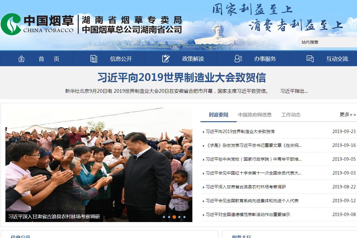 湖南省烟草专卖局成立于1983年10月,湖南省烟草公司组建于1983年7月, 1985年1月正式上划国家烟草专卖局、中国烟草总公司。2003年5月,根据国家烟草专卖局的战略部署,湖南烟草顺利进行工商分设体制改革,成立湖南省烟草专卖局(公司)和湖南中烟工业有限责任公司。湖南省烟草专卖局(公司)管理全省各级烟草专卖局和烟草公司,依法监管全省烟草市场,负责组织全省烟叶生产种植、收购、调拨和卷烟、雪茄烟的批发销售。下辖14个市州烟草专卖局(公司)、90个县级烟草专卖局(分公司)、湖南省烟草职工培训中心(湘潭烟草中专学校)和湖南烟叶复烤有限公司。近年来,湖南省烟草专卖局(公司)深入学习贯彻党的十八大、十九大精神和习近平新时代中国特色社会主义思想,认真落实国家烟草专卖局和湖南省委、省政府的决策部署,紧紧围绕“稳定规模、优化结构、提高质量、增加效益”和“五稳五进”的工作思路和举措,突出抓好“稳产销、提结构、降库存、增税利”重点工作,在现代烟草农业、现代卷烟营销、现代物流配送体系建设、现代企业基础管理等方面取得长足进步,全省系统综合实力显著增强。省局(公司)机关先后获得“全国精神文明建设工作先进单位”“全国文明行业”“全国卷烟打假工作特殊贡献奖”“中华慈善事业突出贡献奖”“全国模范职工之家”等30多项荣誉。新时代、新征程,湖南省烟草专卖局(公司)将继续深入学习贯彻党的十九大精神,以习近平新时代中国特色社会主义思想为引领,增强“四个意识”、坚定“四个自信”、做到“两个维护”,坚持全面从严治党、加快营销转型升级、突出烟叶量质并举、加强专卖管理监督、强化企业管理创新、狠抓干部队伍建设,全面推进全省系统高质量发展,努力为行业和全省经济社会发展作出新的贡献。