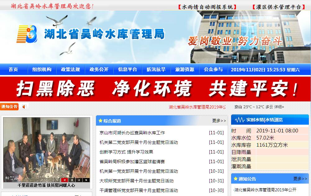 吴岭水库位于湖北省京山县以南,距京山县城17km,系拦截汉北河支流东河上游的余家嘴、斋婆店两条主要河流成库。水库承雨面积102平方公里,总库容6785万立方米,水域面积9.77平方公里,是一座以灌溉为主,兼有防洪、水产养殖、城镇供水等综合效益的中型水利工程。水库的防洪标准为百年一遇设计,千年一遇校核,校核洪水位65.15米,设计洪水位64.15米,正常蓄水位62.20米,主汛期临时汛限水位61.60米,防洪高水位63.30米,死水位52.70米,水库调洪库容2341万立方米,防洪库容872万立方米,兴利库容4390万立方米,死库容50万立方米。吴岭水库为三等工程,主要建筑物为3级建筑物。水库于1958年8月动工兴建,1962年4月竣工,枢纽工程主要由大坝、1#副坝、2#副坝、正常溢洪道和东、西输水管等建筑物组成,其中大坝为粘土均质坝,全长656米,坝顶高程66.32米,坝顶宽度7.0米,最大坝高24.48米;正常溢洪道的溢流堰为宽顶堰型,设计三孔,总净宽24米,由钢板弧形闸门控制,设计下泄流量为406立方米/秒,最大下泄流量为528立方米/秒。吴岭水库所在的东河流域处于江汉平原的北部,位于东经11306′,北纬30053′,属于亚热带气候,具有气候温和,无霜期长等特点,最高温度41度,最低温度-10度,年平均气温为16度,多年平均最大风速为7-8级。流域内雨量充沛,降雨量年内分配不均,大部分集中在5-9月,占全年的65%。水库多年平均降雨量为985.02毫米(统计至2007年,下同),多年平均来水量为3282.5万方,多年平均灌溉水量为1685.1万方,多年平均蒸发量为488.5万方。水库历史最高水位为63.39米 (2007年7月13日),历史最低水位为43.00米 (1966年9月10日),历史最大入库洪峰流量为838.9m3/s(2007年7月13日08时至09:30时),历史最大溢洪流量为143.94m3/s(2007年7月13日)。吴岭水库所在区域地震活动微弱,地壳稳定,根据《中国地震动参数区划图(GB306-2001年)》,确定该地区地震动峰值加速度为0.05g,相应的地震基本烈度为Ⅵ度。吴岭水库2002年被列为全国第一批重点病险水库,2002年底开始除险加固,加固的项目主要包括:(1)大坝加固;(2)重建溢洪道;(3)兴建副坝2#;(4)加固东输水管;(5)重建西输水管;(6)设置大坝原形观测设施,工程总投资3160万元。通过除险加固建设,消除了工程隐患,提高了水库防洪标准,改变了工程形象,美化了周边环境,改善了职工生活和办公条件。吴岭水库灌区于1963年建成,位于京山县以南、天门市以北、应城以西,是湖北省重要的商品粮产地之一,包括京山县和天门市的四个乡镇34个行政村,灌溉设计面积14.6万亩。渠系工程主要由东、西两条干渠,11条支渠和数十条毛渠构成,另有渡槽、水闸、桥梁等各类建筑物200余座(处)。东、西干渠总长31.6公里,设计流量11立方米/秒。吴岭灌区建成以来,共向灌区输出水量7.8亿立方米,确保了京山、天门两县市灌区农业的增产丰收。吴岭水库水土资源比较丰富,共有可养殖水库水面8000亩,配套精养渔池100亩,另有板栗园20亩,桔园100亩,待开发的荒山荒地50亩。同时,优质的水源为京山县钱场镇的工业和生活用水提供了保障,有力地促进了地方经济的迅速发展。多年来,吴岭水库加强综合经营管理,大力开发和充分利用水库的水土资源,创造了较好的经济效益。吴岭水库地理位置十分重要,它直接保护着下游107省道、243省道和随岳高速公路等重要交通干线,以及天门市城区和三个乡镇的29.6万亩耕地、24.7万人口的人民生命和财产的安全,水库多年防洪减灾效益为12亿元。吴岭水库自2003年来,按照《国务院办公厅转发国务院体改办关于水利工程管理体制改革实施意见的通知》(国办发[2002]45号)文件精神,在省水利厅的组织指导和省编办、省财政厅等有关部门的大力支持下,深化水管体制改革,完成了单位定性定编,落实了财政经费,试行了管养分离,实施了内部改革等各项工作,保证了工程防洪抗旱等社会效益的发挥。近几年来,水库管理局加强工程建设与管理,大力发展水库经济,推进水库事业又好又快发展,逐步向“全省中型水库管理工作一流水平”的目标迈进。管理局在1998年获得抗洪抢险“先进集体”荣誉称号, 2000年被省水利厅授予“文明单位”,2006年获得“档案目标管理省一级”管理单位,2009年被中共湖北省委省直机关委员会授予“2007-2008年度文明单位”,2010年被京山县评为“2010年度社会治安综合治理工作先进单位”,2011年分别被省直机关工委、省水利厅直属机关委员会授予“2009—2010年度先进基层党组织”。2011年被省直机关工委授予“2009-2010”年度文明单位。局工会2011年被省创争活动领导小组评为“湖北省创争活动优秀组织单位”,被省水利工会评为工会工作创先争优考核“先进单位”。2012年被省绿化为授予全省国土绿化先进单位、模范单位,被省防汛抗旱指挥部授予“2011年全省防汛抗旱先进集体”。2012年6月被省水利厅直属机关党委授予“2010—2012年创先争优先进基层党组织”。