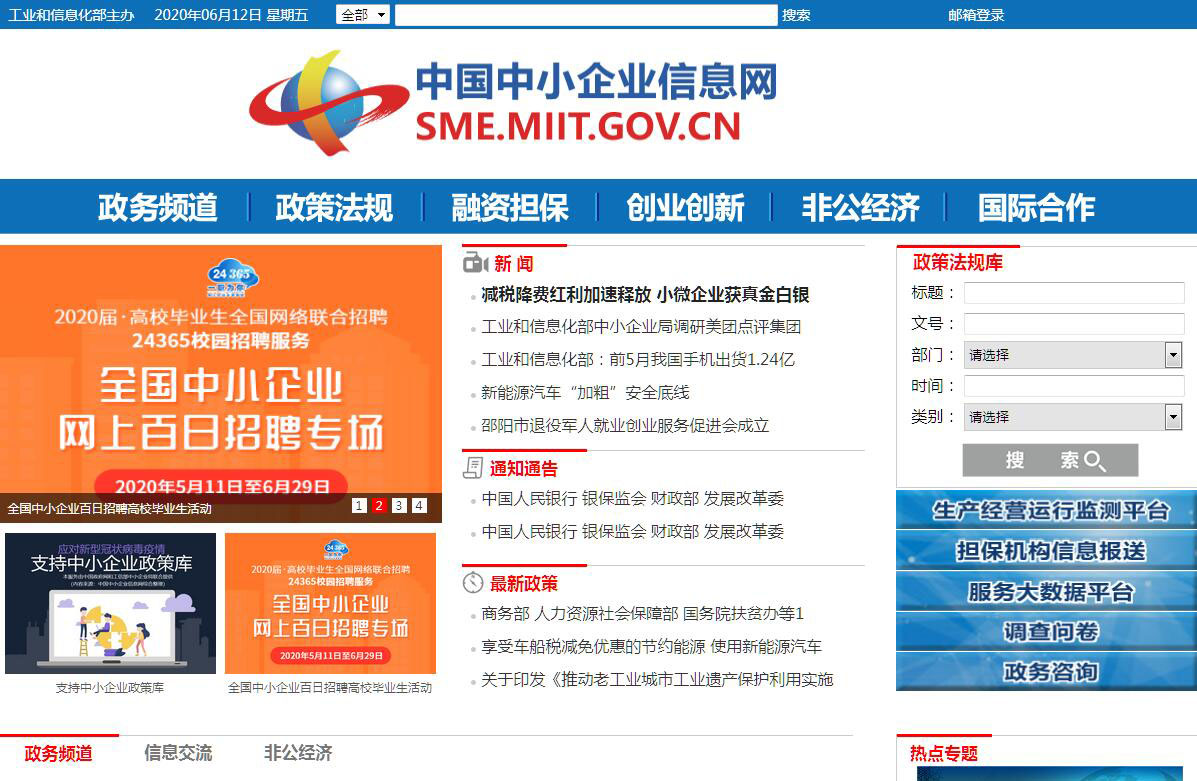 | 网站简介: “中国中小企业信息网”(sme.miit.gov.cn)是由国家工业和信息化部主办的政府公益性中小企业服务网站。该网站于2001年8月正式开通,由当时的国家经济贸易发展委员会会主办。2003年,随国家机构改革,调整为由国家发展改革委员会主办,并在国家发展和改革委员会中小企业司的指导下委托中介机构运作。2008年,因国家机构调整,国家发展改革委中小企业司进入工业和信息化部,中国中小企业信息网也随之改为由工业和信息化部主办,中小企业司具体业务指导。 |