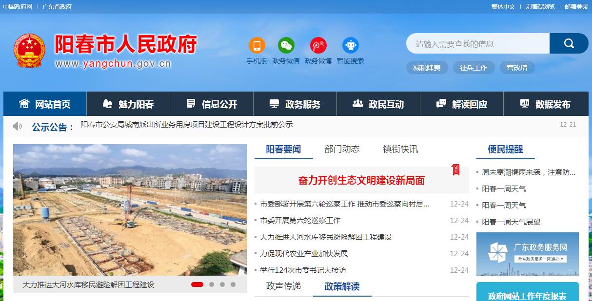 阳春,意取“漠水之阳,四季如春”,地处广东省西南部、漠阳江中上游,属于阳江管辖的县级市。全市总面积4037.8平方公里,总人口120.9万人,常住人口88.7万人;下辖15个镇、2个街道,309个行政村、40个社区。先后获得中国优秀旅游城市、中国国家地质公园、中国马水桔之乡、中国春砂仁之乡、全国科普示范市、全国政务公开示范点、广东省文明城市、广东省卫生城市、广东省园林城市、广东省教育强市等20多项荣誉称号。历史底蕴深厚。自战国时期为百越地,至今已有1774年历史,三国吴赤乌元年(238年)置莫阳县,为阳春地建县之始;南朝梁普通四年(523年),撤销莫阳县,改设阳春郡并置阳春县;1994年5月撤县设市(县级)。阳春是广东古来文明之地,留下不少古迹和文物,有独石仔洞穴遗址、崆峒岩摩崖石刻、春湾通真岩摩崖石刻等,已被列为省级文物保护单位。阳春民俗文化丰富,有历史悠久的阳春根雕、陂面镇重阳古墟、合水镇高流河墟、石望镇梁镇南将军府炮会等非物质文化遗产。自然资源丰富。阳春地属亚热带雨林气候,雨量充沛,气候温和,土地肥沃。漠阳江水环境质量总体达国家优良标准,饮用水源水质达标率100%,环境空气质量保持国家二级水平。林业用地面积408万亩,森林覆盖率达67.7%。矿产资源储量大、品位高,是全国矿产最丰富的6个县之一,已探明的矿种有40多种,其中石灰石总储量60亿吨。旅游资源得天独厚,拥有南国第一名胜的凌霄岩、国内影视拍摄重要基地的春湾石林、全国四大崆峒山之一的崆峒岩、岭南第一瀑的白水瀑布、中国第一氡泉的春都温泉和鹅凰嶂、百涌省级自然保护区等,阳春八景凌霄秀色、鹅凰飘瀑、春湾奇观、东湖春晓、崆峒禅踪、漠阳古韵、春都氡泉、凤凰朝阳名闻遐迩。鸡笼顶高山草原、鹅凰嶂森林生态、马兰田园风光等生态旅游景点正加快规划建设。交通快捷便利。三茂铁路、阳阳铁路、云阳高速、汕湛高速、省道113线、省道369线贯穿全境,随着中阳高速阳春段等高速公路全线建成通车,阳春将成为珠三角与粤西的重要交通枢纽,实现全面融入珠三角1小时生活圈。城市功能不断完善。近年来,阳春市区重点打造“一江两岸”和河东、河西“三大城市板块”,形成了市区“五横三纵”和“一环路”快速交通网络。目前,市区建成区面积32平方公里,规划面积45.5平方公里,常住人口29万人。教育、文化、卫生等公共服务设施不断完善,商贸流通、餐饮住宿、金融保险等服务业快速发展,创国卫工作有序推进,宜居宜业环境不断优化,城市品位进一步提升。经济社会健康发展。近年来,阳春市紧紧围绕“坚持加快发展,实现绿色崛起,决胜全面建成小康社会”的目标任务,突出推动新型工业化、新型城镇化、新型信息化三化驱动和生态旅游、生态养老、生态农业三大生态产业融合发展,着力培育原材料、装备制造、医药、食品四个百亿级产业集群,全市经济社会持续健康发展。2017年,全市实现生产总值409.2亿元,增长5.9%;规模以上工业总产值390亿元、增加值72亿元,分别增长3.3%和4.9%;农业总产值123.5亿元,增长3.3%;接待游客342.8万人次,旅游收入55.2亿元,分别增长25.6%和26%;地方一般公共预算收入11.3亿元,增长11.7%;固定资产投资120.3亿元,增长11.7%;城镇和农村常住居民人均可支配收入分别为25680元、13800元,分别增长9%和3%。