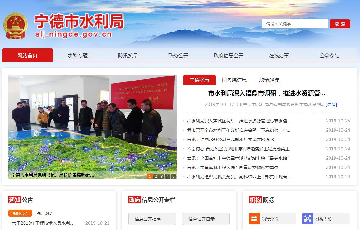 宁德市水利局主要职责:(一)贯彻执行国家和省有关水利工作的法律法规、规章和政策,起草并组织实施有关水利工作的规范性文件;组织编制省、市政府确定的重要中小江河流域综合规划、防洪规划等重大水利规划;按规定制定水利工程建设相关制度并组织实施,负责提出水利固定资产投资规模和方向、市政府财政性资金安排的意见;提出市水利建设投资安排建议并组织实施。(二)负责保障水资源的合理开发利用。负责生活、生产经营和生态环境用水的统筹兼顾和保障;实施水资源的统一监督管理,会同有关部门拟订全市和跨县(市、区)水的中长期供求规划、水量分配方案并监督实施;组织开展水资源调查评价工作,按规定开展水能资源调查工作,负责重要流域、区域以及重大调水工程的水资源调度;组织实施取水许可、水资源有偿使用制度和水资源论证、防洪论证制度;指导水利行业供水和乡镇供水工作。(三)负责水资源保护工作。组织编制水资源保护规划,会同环境保护行政主管部门和其他有关部门组织拟订重要江河的水功能区划并监督实施;核定水域纳污能力,提出限制排污总量建议,指导饮用水水源保护工作,指导地下水开发利用和城市规划区地下水资源管理保护工作。(四)负责防治水旱灾害,承担市政府防汛抗旱指挥部的日常工作。组织、协调、监督、指挥全市防汛抗旱工作,对重要江河和重要水工程实施防汛抗旱调度和应急水量调度,编制市防汛抗旱应急预案并组织实施。指导水利突发公共事件的应急管理工作。(五)负责节约用水工作。拟订节约用水政策,编制节约用水规划,制定有关标准,指导和推动节水型社会建设工作。(六)指导水利设施、水域及其岸线的管理和保护,指导主要江河、河口和沿海滩涂的治理和开发,组织、指导江堤海堤建设,指导水利工程建设与运行管理,组织实施具有控制性的或跨县(市、区)及跨流域的重要水利工程建设与运行管理。(七)负责防治水土流失。拟订水土保持规划并监督实施,组织实施水土流失的综合防治,负责辖区内开发建设项目水土保持方案的审批、监督实施及水土保持设施的验收工作,指导市重点水土保持建设项目的实施。(八)指导农村水利工作。组织协调农田水利基本建设,指导农村饮水安全、节水灌溉、泵站改造、雨水集蓄利用等工程建设与管理工作,指导农村水利社会化服务体系建设。(九)指导农村水电工作。按规定指导农村水能资源开发工作,指导水电农村电气化和小水电代燃料工作;承担装机5万千瓦及以下水电站建设行政管理与运行管理工作。(十)负责涉水行政违法(不含治安违法)案件的查处,协调、处理跨县(市、区)水事纠纷,指导水政监察和水行政执法。依法负责水利行业安全生产工作,组织、指导水库、水电站大坝的安全监管;指导水利建设市场的监督管理,组织实施水利工程建设的监督;负责全市四级及其以下河流河道采砂规划的审批,组织实施对河道采砂的监督、管理。(十一)负责水利科技和外事工作。组织、指导水利行业质量监督工作,组织实施水利行业的技术质量标准和水利工程的规程规范;组织水利科学研究、技术引进和科技推广;办理水利有关涉外事务。(十二)承办市委、市政府交办的其他事项。