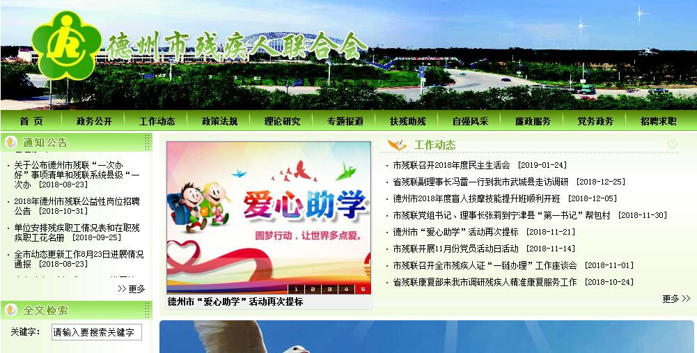 德州市残疾人联合会是经德州市人民政府批准和国家法律确认的将残疾人自身代表组织、社会福利团体和事业管理机构融为一体的残疾人事业团体。其宗旨是:弘扬人道主义,促进残疾人平等、充分参与社会生活,共享社会物质、文化成果。具有“代表、服务、管理” 三种职能:代表残疾人共同利益,维护残疾人合法权益;团结教育残疾人,为残疾人服务;履行法律赋予的职责,承担政府委托的任务,管理和发展残疾人事业。其主要职责:(一)宣传贯彻《中华人民共和国残疾人保障法》及其相关法规,维护残疾人在政治、经济、文化、社会和家庭生活等方面同其他公民平等的权利,密切联系残疾人,听取残疾人意见,反映残疾人需求,全心全意为残疾人服务。(二)团结、教育残疾人遵守法律,履行应尽义务,发扬乐观进取精神,自尊、自信、自强、自立,为全面建设小康社会,推进现代化建设贡献力量。(三)沟通政府、社会与残疾人之间的联系,宣传残疾人事业,动员社会理解、尊重、关心、帮助残疾人。(四)开展和促进残疾人康复、教育、就业、扶贫、社会保障、维权、文化体育、和残疾预防等工作,改善残疾人参与社会生活的环境和条件。(五)参与研究、制定和实施残疾人事业的法律、法规、政策、规划和计划,发挥综合、协调、咨询、服务作用,对有关领域的工作进行管理和指导。(六)承担德州市人民政府残疾人工作委员会的日常工作。(七)管理和发放《中华人民共和国残疾人证》。(八)管理和指导各类残疾人群众组织,培养残疾人工作者,使残疾人在残疾人组织中更加活跃,残疾人组织在基层更加活跃,残疾人和残疾人组织在社会上更加活跃。(九)开展残疾人事业的对外交流与合作。(十)承担德州市人民政府交办的其他工作。