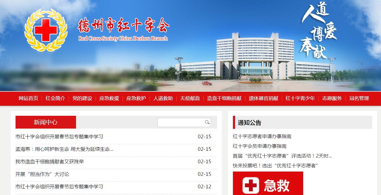 德州市位于山东省西北部。地处黄河(德水,古黄河别名)故道,运河之滨,是一座河流文明造就的古城。德州自古就有“九达天衢”、“神京门户”之称,是华东、华北重要的交通枢纽。京沪、德石、济邯三条铁路在这里交汇,5条国道、14条省道在境内纵横交错。京福高速公路贯穿南北,济聊、青银高速公路穿境而过。德州市红十字会是中国红十字会的地方组织,是从事人道主义工作的社会救助团体。1911年10月山东省红十字会成立后,1928年夏津县红十字分会慈善医院成立;1929年1月(民国18年)德州红十字会成立。原在城东南安庄嗣,因感乡间不便,遂迁至城内淮堤庵内(小锅市),至德州城解放(1946年);1948年2月,在临邑县城南邓井子村成立“洛北红十字医院”;1957年经山东省人民委员会批准,德州市红十字会成立;1984年8月23日德州地区红十字会成立。1995年,德州撤地建市,德州地区红十字会更名为德州市红十字会。近年来,在抗洪救灾、抗击“非典”等方面共接收发放救灾救助物资折合人民币500余万元,使80余万人受益。2008年支援汶川地震募捐工作中,全市红十字会系统共接收社会各界捐款捐物1341.96万元。被山东省红十字会授予“支援四川抗震救灾突出贡献奖”,被市委、市政府授予“德州市抗震救灾工作先进集体”、“德州市对口支援北川灾后恢复重建工作先进集体”。2013年、2014年分别开展支援四川雅安、云南鲁甸地震灾区抗震救灾工作,为灾区群众募集款物合计52.84万元。在全市红十字会、卫生系统开展的支持“新农合”募捐救助活动中,共发放救助金700余万元,受益人口6万余人。积极开展无偿献血、遗体(器官)捐献、造血干细胞捐献工作。2000年底全市临床用血实现了100%来自无偿献血。2014年3月实现我市器官捐献零的突破,截至2017年7月,共实现器官捐献3例,遗体捐献16例,眼角膜捐献25例。2004年,中国造血干细胞捐献者资料库山东省分库德州市工作站启动,截止2017年7月,共采集造血干细胞血样11200余人份,成功实现造血干细胞捐献28例。