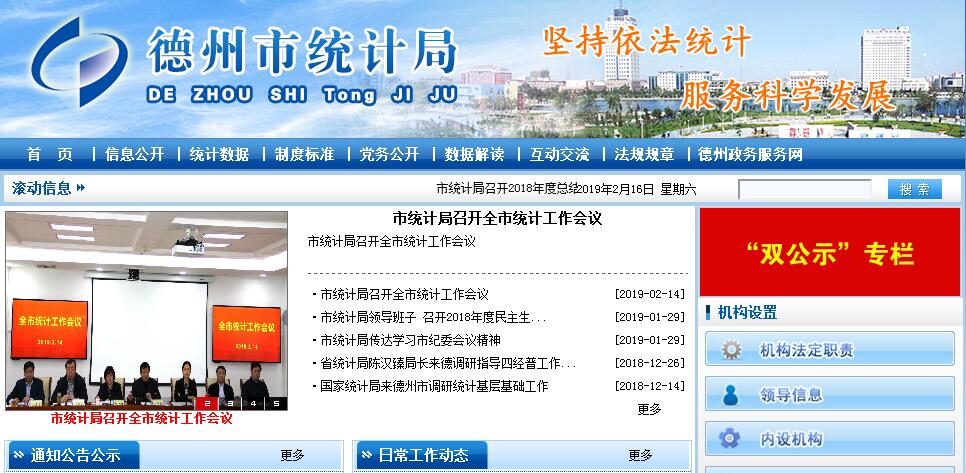 德州市统计局主要职责:(一)承担组织领导和协调全市统计工作,确保统计数据真实、准确、及时的责任;组织实施国家和省有关统计法律法规、政策、规划、统计制度和统计标准,制定、拟订全市统计工作规范性文件、统计现代化建设规划及统计调查计划并监督实施;依法监督涉外社会调查活动,依法查处统计违法行为。(二)建立健全全市国民经济核算体系和统计指标体系;依法审批各县(市、区)、各部门的统计调查项目,审核统计计划、调查方案;建立健全统计数据质量审核、监控和评估制度,开展对重要统计数据的审核、监控和评估;指导部门统计工作。(三)根据国家重大国情国力普查计划、方案,拟订全市的实施方案,会同有关部门组织实施人口、经济、农业等重大国情国力普查;统一组织协调各县(市、区)、各部门的社会经济调查,汇总整理全市的基本统计资料;对全市国民经济、科技进步和社会发展等情况进行统计分析、统计预测和统计监督,向市委、市政府及有关部门提供统计信息和咨询建议。(四)统一核定、管理、公布全市性的基本统计资料,定期向社会公众发布全市国民经济和社会发展情况的统计信息。(五)建立并管理全市统计信息自动化系统和统计数据库系统,指导各县(币、区)、各部门统计信息化系统建设。(六)按照干部管理权限,协助管理县(市、区)统计部门负责人;指导全市统计基础建设和统计队伍建设;组织实施统计从业资格认定工作;监督管理省统计局划拨的统计事业经费。(七)指导全市统计科学研究、干部培训等工作。(八)承办市委、市政府交办的其他事项。