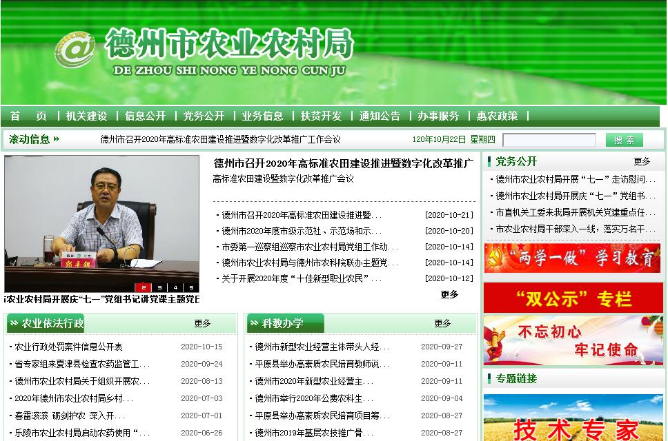 | 网站简介: 根据德州市市级机构改革实施意见,整合市农业局及相关方面的农业农村管理职责,组建德州市农业农村局,作为市政府组成部门,正处级规格。其主要负责统筹研究和组织实施“三农”工作战略、规划和政策,协调解决“三农”工作重大问题;管理种植业、畜牧业、渔业、农垦、农业机械化、农产品质量安全;负责农业投资管理等。 |