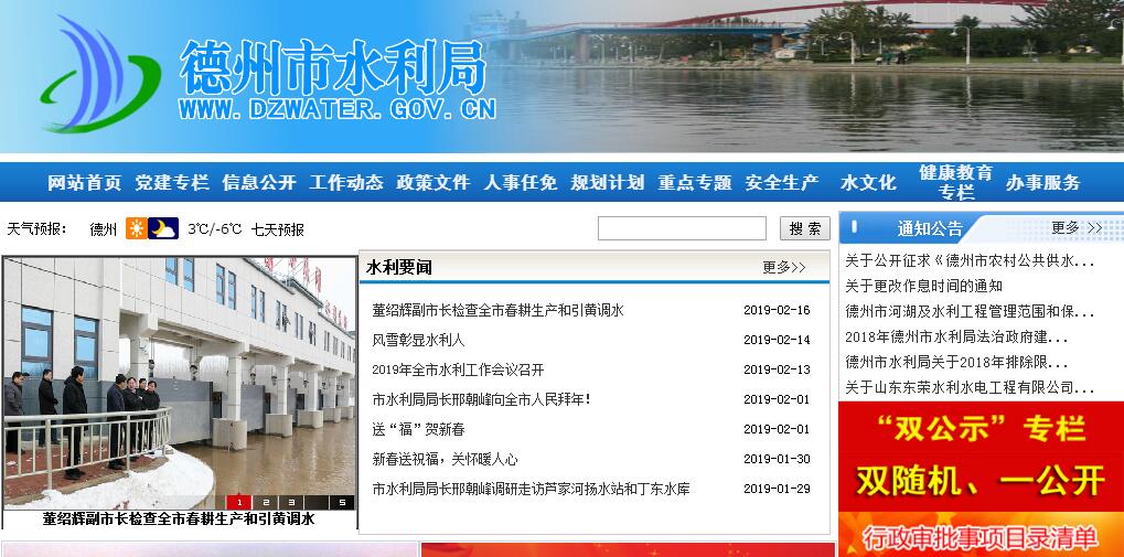 德州市水利局主要职责:(一)贯彻执行国家和省、市有关水利工作的方针政策和法律法规,拟订全市水利工作的政策规定和管理办法,并负责组织实施。(二)负责统筹水资源的合理开发利用。拟订全市水利发展中长期规划和政策,组织编制水利综合规划、专项规划;提出水利固定资产投资规模和方向、财政性资金安排建议,提出水利建设投资安排建议并组织实施;会同有关部门负责市级水利资金和水利国有资产监督管理工作;提出有关水利价格、收费、信贷、税收的政策建议。(三)负责生活、生产经营和生态环境用水的统筹兼顾和保障。实施水资源的统一监督管理;拟订全市水中长期供求规划、水量分配方案并监督实施;负责重要流域、区域以及重点调水工程的水资源调度;组织实施取水许可、水资源有偿使用、水资源论证等制度;指导城市污水处理回用、浅层微咸水和雨洪资源开发利用工作;指导水利行业供水和农村水能资源开发、小水电等工作。(四)承担水资源保护和节约用水的责任。组织编制全市水资源保护规划;拟订重要河流、湖泊、水库的水功能区划并监督实施;核定水域纳污能力,提出限制排污总量急见,指导入河排污口设置工作;负贡饮用水水源保护、地下水开发利用和保护工作;拟订并组织实施节约用水政策,指导和推动节水型社会建设。(五)承担市政府防汛抗旱指挥部的日常工作。组织、协调、监督、指挥全市防汛抗旱工作;负责对土地利用总体规划、城市规划和其他涉及防洪的规划、重大建设项目布局的防洪论证提出意见;负责重要洪泛区、蓄滞洪区和防洪保护区的洪水影响评价工作;指导水利突发公共事件的应急管理工作。(六)组织、指导水利工程建设与管理工作。指导水利设施、水域、河道及其岸线的管理与保护;负责主要河流、湖泊、水库的治理和开发;组织实施具有控制性的或跨县市区、跨流域的重要水利工程建设与运行管理;组织实施水利工程建设有关制度;指导水利建设市场的监督管理;按规定权限审查河道管理范围内建设项目、工程建设方案。(七)负责水利水电移民工作的监督管理。负责组织编制全市水库移民后期扶持规划及有关专项规划;负责水库移民后期扶持项目的监督管理、扶持资金的使用管理与监督检查及移民补偿和安置的验收工作;负责水库移民政策的宣传、移氏培训和信访工作。(八)负责农村水利工作。组织协调农田水利基本建设;指导农田灌溉排水、村镇供水工作;组织实施农村饮水安全、节水灌溉等工程的建设与管理;负责引黄灌溉工作;指导农村水利社会化服务体系建设。(九)负责水土保持工作。组织编制水土保持和水生态建设规划并监督实施;组织实施水土流失的综合防治、监测预报并定期公告;负责重点开发建设项目水土保持方案的审批、监督实施和水土保持设施的验收工作;归口管理荒丘、荒滩、荒沟的治理开发工作。(十)负责水政监察和水行政执法工作。负责重大涉水违法事件的查处;调解处理县(市、区)间的水事纠纷,受市政府委托调解处理市际间水事纠纷;组织实施水利行政许可和水利行政事业性收费征收管理工作;组织实施水利工程经营性收费的计收管理工作。(十一)负责重点水利工程安全生产监督管理,指导水利行业安全生产工作;组织实施水利工程质量和安全监督。(十二)编制、审查市内大中型水利基建项目建议书和可行性报告;组织实施重大水利科学研究、科技推广工作;组织实施水利行业技术烦量标准,监督实施水利工程的规程、规范;会同有关部门负责水利工程招投标的行政监督。(十三)会同有关部门负责水利系统对外交流、利用外资、引进国(境)外智力等工作;组织指导水利宣传、信息化、人才队伍建设等工作。(十四)协调指导水文水资源监测、水文站网建设和管理;对地表水和地下水水量、水质实施监测;发布雨情、水情等水文水资源信息、情报预报和水资源公报。(十五)负责协调客水水源工程的建设与管理;负责协调市内涉及黄河、漳卫河的有关事务。(十五)承办市委、市政府交办的其他事项。