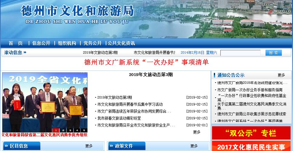 | 网站简介: 德州市文化和旅游局是德州市机构改革组建的新部门。德州市文化和旅游局,是整合市文化广电新闻出版局的职责,以及市旅游局、市文物局(市大运河遗产保护处)承担的行政职能。加挂市新闻出版广电局、市文物局牌子,归口市委宣传部领导。不再保留市文化广电新闻出版局。 |