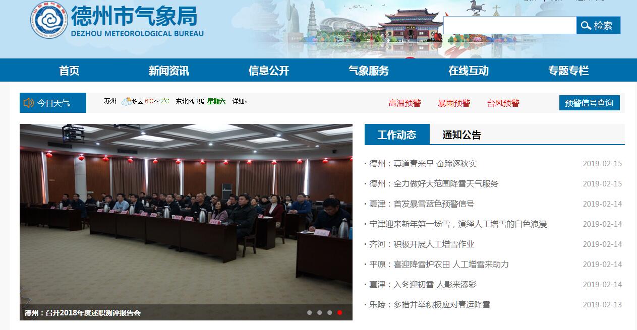 德州市气象局主要职责:1.指导、监督德州市行政区域内的气象活动,行使行业管理职能;负责德州市行政区域内气象事业发展规划、计划的制定和气象业务建设的组织实施及气象设施建设项目的审查;组织协调完成德州市行政区域内天气、气候、生态与农业气象、人工影响天气、雷电等多轨道业务工作;组织管理德州市行政区域内综合观测、预测预报、公共气象服务和信息与技术支持平台的有关工作。2.负责德州市行政区域内的气象观测工作,组织管理德州市行政区域内气象观测资料的汇总、传输,依法保护气象探测环境。3.负责德州市行政区域内的预报管理工作,及时提出气象灾害防御措施,并对重大气象灾害作出评估,为政府组织防御气象灾害提供决策依据;管理德州市行政区域内公众气象预报、灾害性天气警报以及农业气象预报、城市环境气象预报、火险气象等级预报等气象预报的发布。4.管理德州市行政区域人工影响天气工作,指导和组织人工影响天气作业;组织管理雷电灾害防御工作,会同有关部门指导对可能遭受袭击的建筑物、构筑物和其它设施安装的雷电灾害防护装置的检测工作;负责德州市行政区域内的防雷减灾和升空气球安全督查工作。5.负责向德州市人民政府和同级有关部门提出利用、保护气候资源和推广应用气候资源区划等成果的建议;组织气候可行性论证。6.组织开展气象法制宣传教育,负责监督气象法规的实施,负责德州市行政区内的气象行政执法,承担有关行政复议和行政诉讼。7.统一领导和管理德州市行政区域内气象部门的计划财务、人事劳动、科研和培训以及业务建设等工作;会同县级人民政府对县气象机构实施以部门为主的双重管理;协助地方党委和人民政府做好当地气象部门的精神文明建设和思想政治工作。8.承担上级气象主管机构和德州市人民政府交办的其它事项。