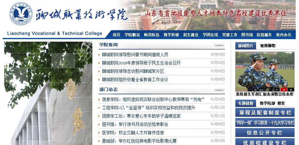 聊城职业技术学院是2000年10月经山东省人民政府批准成立的公办全日制普通高等专科学校,由原聊城卫生学校、聊城广播电视大学、聊城地区旅游职业中等专业学校和聊城市畜牧研究所合并组建而成,是首批“山东省示范性高职院校”和“山东省技能型人才培养特色名校”,是山东省职业教育学会德育工作委员会主任单位,是聊城市政府建设聊城现代职业教育体系的龙头单位。学院所在地——山东省聊城市,是国家历史文化名城,京九铁路与邯济铁路在这里交汇,是冀鲁豫三省交界地区的中心城市和物流枢纽,中原经济区东部核心城市,济南都市圈副城市,山东西部经济隆起带中心城市,区位优势得天独厚。学院确立了“引领鲁西、示范山东、影响全国”的特色名校办学目标,着力打造山东省西部技术技能人才培养基地、职业技能培训基地、技术研发服务基地、先进文化传播基地。80多名海内外知名学者担任学院客座教授。学院占地面积63.4万平方米,建筑面积27.26万平方米,馆藏纸质图书87万册,电子图书资料530万册。建有现代化的教学楼、实训室、图书馆、网络中心、学生公寓、餐厅、大学生文化广场、鲁西革命史馆、综合实践基地等设施,200亩新校区正在规划建设中。校园环境优雅,人文氛围浓郁,是读书求学的理想场所。(截至2018年6月)学院现设有护理学院、医学院、建筑学院、工程学院、汽车学院、经济管理学院、信息学院、旅游管理学院、农牧科技学院、继续教育学院、中原现代农业商学院、思想政治课教学部、体育部、基础部等14个二级教学院部,43个专科招生专业,涵盖了护理、机电、汽车检测与维修、建筑工程、物流、计算机网络技术、数控、酒店管理、康复治疗、会计电算化、电子商务、园林园艺等与经济社会发展密切相关的专业,招生范围覆盖山东、河南、宁夏、山西、吉林、安徽、内蒙、甘肃、江苏、贵州等10个省、自治区。现有全日制在校生13000余人。(截至2018年6月)学院坚持以教学为中心,持续推进“做学教”项目教学改革,全面提高教育教学质量。学院现有专兼职教师1034人,副高以上职称教师164人,具有博士、硕士学位教师310人,双师素质比例达90.4%,省级优秀教学团队5个,山东省教学名师5人,青年技能名师2人,建成国家级精品课程和国家级资源共享课2门、省级精品资源共享课8门,中央财政支持专业3个、省级特色专业7个,省级品牌专业群1个,“3+2”专本贯通分段培养试点专业2个,省级现代学徒制试点专业2个,省级职业教育“十百千工程”示范专业2个,名师工作室2个,获得国家级教学成果二等奖1项,省级教学成果奖5项。2012年,学院顺利通过教育部高职高专院校人才培养工作水平评估复评。2015年12月,学院以优秀成绩通过首批“山东省技能型人才培养特色名校”检查验收。(截至2017年6月)学院坚持“以人为本,质量立校”的办学理念,大力实施人才培养模式改革,引领职业教育创新发展。打通人才成长立交桥,与聊城大学、济宁医学院共建机电一体化技术、护理两个“3+2”专本贯通培养专业;组建“聊城市第一职教集团”,整合优质教育资源,推进集团化办学,实现“政行企校四方联动、校企相融互利共生”;以就业为导向,强化技能培养,打造高素质技能型人才。学院被教育部等六部委确定为“护理专业技能型紧缺人才培训学校”,被教育部、财政部确定为“中央财政支持的护理专业实验实训基地”,是解放军总医院(301医院)在全国建立的护理人才培养基地之一,是上汽大众SCEP校企合作项目在全国规模最大、功能最全的钣喷院校基地。学院先后获得山东省文明校园、文明单位、国家语言文字规范化示范校、德育工作优秀高校、国防教育先进单位、高校标准化食堂、资源节约先进单位、高校后勤服务先进单位、高校科研管理先进集体、职业教育科研工作先进集体、学生军训工作先进单位、党员教育工作先进单位、百姓口碑最佳荣誉单位、富民兴鲁劳动奖状等荣誉。学院实行开放办学,着力建设高端合作平台。与解放军总医院、解放军三〇二医院、海军总医院、空军总医院、火箭军总医院等各兵种总医院合作,打造高端护理人才培养基地;与中德莱茵公司合作,打造现代制造业实训中心;与阿里巴巴合作,共建电子商务人才培养基地;与人民卫生出版社合建“全国职业院校医护技能大赛基地”;与莘县政府、当代集团深度合作,共建中原现代农业商学院;与东胶集团联建“东阿阿胶学院”;与山东舜和酒店集团建设“舜和商学院”。学院依托行业、企业共建技能大师工作室、创业教育实践平台,建立校外实习实训基地242处,与中国重型汽车集团、上汽大众、思科公司、惠普公司、甲骨文公司、海尔集团、中国重汽、东风日产、华为公司、浪潮集团、中铁十四局、北方汽车、中通客车、中兴集团、京东、网易、齐鲁制药、顺丰速运、钓鱼台国宾馆、齐鲁软件园、鲁西集团等一流企业,以“订单班”、“校中厂”、“大学生创业孵化基地”、现代学徒制试点班等多种形式开展合作,积极探索校企联合招生、协同育人,构建校企双主体育人平台。目前,学院拥有机电一体化、电子商务2个省级现代学徒制试点专业。近三年,学院累计投入4600余万元,用于改、扩、建校内实训基地155个,建设了一批校内仿真实训中心,成功营造了校内生产性或仿