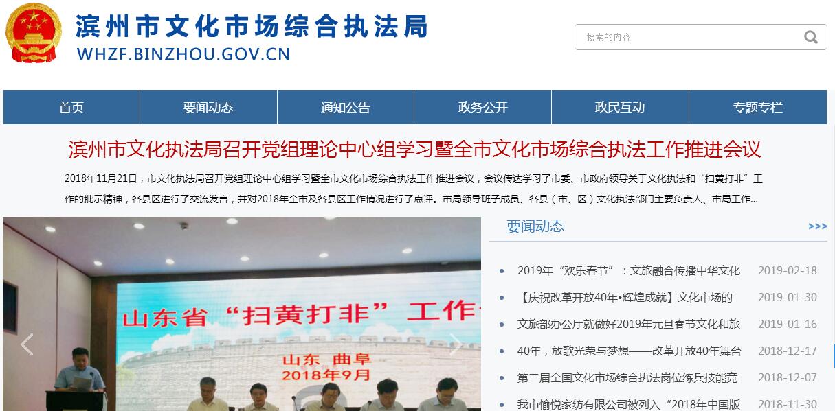 滨州市文化市场综合执法局主要职责:(一)贯彻执行国家和省有关文化、广播电影电视、新闻出版和版权管理的法律法规和方针政策;拟定全市文化市场行政执法的规范性文件、总体规划和年度计划并组织实施。(二)依据有关法律、法规、规章和政策规定,行使对文化市场管理的行政处罚权,以及与行政处罚权相关的行政强制权和行政检查权。(三)负责查处文化市场重大案件,组织全市性治理文化市场专项行动。(四)负责查处演出、文化娱乐、网吧及互联网上网服务、网络游戏、电子游戏、美术品销售、文物经营,图书、报纸、期刊、音像制品、电子出版、网络出版、手机书刊、手机文学业务、计算机软件,印刷、复制、出版物发行等经营活动中的违法违规行为;查处违法违规新闻活动;查处广播电影电视、信息网络视听领域的违法违规行为;查处卫星地面广播电视接收设施方面的违法违规行为。(五)负责查处著作权侵权盗版行为,调解著作权纠纷;负责文化市场执法过程中发现的非法出版物的鉴定工作。(六)负责县(区)文化市场综合执法机构的业务指导、协调监督和考核评比工作;负责对全市文化市场行政执法人员的业务培训。(七)负责受理对文化市场违法行为的投诉、举报,受理行政相对人对文化市场综合执法机构具体行政行为的行政复议申请。(八)承担市文化市场执法暨“扫黄打非”工作领导小组办公室的日常工作。(九)负责本机关及所属单位的安全管理工作。(十)承办市委、市政府交办的其它事项。