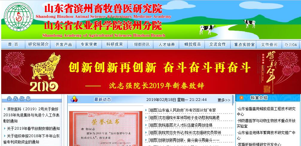 山东省滨州畜牧兽医研究院&山东省农业科学院滨州分院系创建于1963年的原山东省家畜布氏杆菌病防治研究所,曾隶属于山东省农科院、山东省农业厅。1995年经省编委、省科委批准更名为山东省滨州畜牧兽医研究所,2005年12月更名为山东省滨州畜牧兽医研究院,2006年2月经山东省农业科学院批准,加挂“山东省农业科学院滨州分院”的牌子, 2009年4月加挂“山东省农业科学院黄河三角洲高效生态经济研究中心”的牌子。2009年5月吉林大学兽医博士、硕士学位教学科研基地与研究生联合培养基地及吉林大学畜牧兽医学院教学科研基地在该院成立。标志着该院研学产合作进入了新的阶段。山东省滨州畜牧兽医研究院瞄准国际科技前沿,紧紧围绕国家、省、市畜牧业与生物医药产业及农村经济的发展方向与目标,大力开展应用基础研究、应用研究、高新技术研究和竞争前公益技术研究,积极开展成果转化、科技示范、科技培训、科技服务等工作,为发展现代畜牧业与生物技术产业、保障食品安全与人类健康、建设新农村、发展新牧业、服务新农民提供技术支撑和技术服务!山东省滨州畜牧兽医研究院技术力量雄厚,现有员工79名,在职员工60名,其中,研究员4名,副研究员10名,国家有突出贡献的中青年专家1名,中国青年科技奖获得者1名,荣享国务院政府特贴专家1名,全国优秀科技工作者1名,国家级科技思想库决策专家1名,农业部高级专家库高级专家1名,中国青年国际创业计划创业导师1名,省十佳中青年科技专家1名,省有突出贡献的中青年专家1名,泰山学者海外特聘专家1名,省创新团队岗位专家2名,省政府农业专家顾问团专家1名,省禽流感防控专家组专家1名,博士生导师1名,硕士生合作导师7名,市有突出贡献的专业技术人员5名,市青年科技奖获得者14名,市青年学术技术带头人培养人选7名,博士、硕士学位40余名;全国人大代表1名,省人大代表1名,市人大常委1名,市政协常委1名,省劳模1名,市劳模4名。离退休职工19名,其中,荣享国务院政府特贴专家5名,省劳模2名。全院现拥有国家博士后科研工作站、山东省畜禽用蜂胶疫苗工程技术研究中心、省兽医生物技术重点开放实验室、预防兽医学与动物生物技术重点开放实验室、省中英禽病防控技术国际合作研究中心、山东省现代产业技术体系羊创新团队疫病防治岗位专家、家禽创新团队生产与环控岗位专家、生猪创新团队综合试验站、牛创新团队滨州综合试验站等国家级、省级科技创新平台;科技创新系统设有生物制品、动物保健品、动物医学、人兽共患病、动物营养、动物生产、食品科技与安全等7个研究室;科研转化推广系统设有山东省畜禽用蜂胶疫苗研究开发推广中心与山东省洼地绵羊繁育技术研究开发中心2个省级成果推广中心、家畜胚胎移植研究开发中心、山东省洼地绵羊原种场、畜禽良种研究推广中心、鲁北兽医诊断中心等。科技支撑管理服务系统设有办公室、科技处、国际合作处、人才人事教育科(博士后管理办公室)、财务审计室、院工会、团委等。主要研究领域涵盖了山东乃至全国畜牧兽医发展主要领域,在预防兽医学、生物工程、动物保健品、动物繁殖育种等领域形成自身优势。尤其是对绿色畜禽蜂胶疫苗的研究,打破传统疫苗制造常规,独创发明了纳米蜂胶疫苗制造工艺技术平台,居世界领先水平。50年来,先后承担各类科研课题300多项,其中,国家、省、市级科研课题130余项,共获得国家、省、市科技成果奖160多项,制定国家、省标准50多项,获中国发明专利1项,在国际国内学术刊物发表论文1000多篇,其中有200余篇被SCI、EI、ISTP、Agris等国外权威刊物收录。主编参编学术专著20余部,居世界领先水平的禽霍乱蜂胶灭活疫苗荣获国家发明三等奖,并先后获得国家发明专利证书、国家级新产品证书、国家级新兽药证书和产品批准文号,畜禽用蜂胶疫苗系列产品被科技部列为国家级科技成果重点推广计划,产品已推广到全国30个省、市、自治区,年创社会经济效益20多亿元以上。与吉林大学、中国农大、南京农大、山东农大、青岛农大等联合培养博士后、博士、硕士研究生,已培养博士、硕士生60余名,在读博士后、博士、硕士研究生30余名;培训全国各地高、中、初级专业技术人员两万余名,培训全国各地养殖能人与专业户数十万人。与美国、加拿大、澳大利亚、德国、日本、比利时等国的相关单位建立了合作与交流关系。初步形成了研、学、产相结合,科研、开发、生产、推广、服务一体化的现代化与产业化格局。荣获“全省农业科研与技术推广先进单位”、“山东省畜牧业科技先进单位”、“山东省文明单位”、“滨州市文明单位”、“滨州市人才工作先进单位”、“滨州市科技先进集体”等荣誉称号。在科学发展观的指导下,该院将站在新起点,谋划新发展,实现新跨越,与时俱进,同心同德,开拓创新,拼搏进取,建设新的蓝图,再创新的辉煌!为发展现代畜牧业和生物技术产业,全面建成小康社会而团结奋斗!