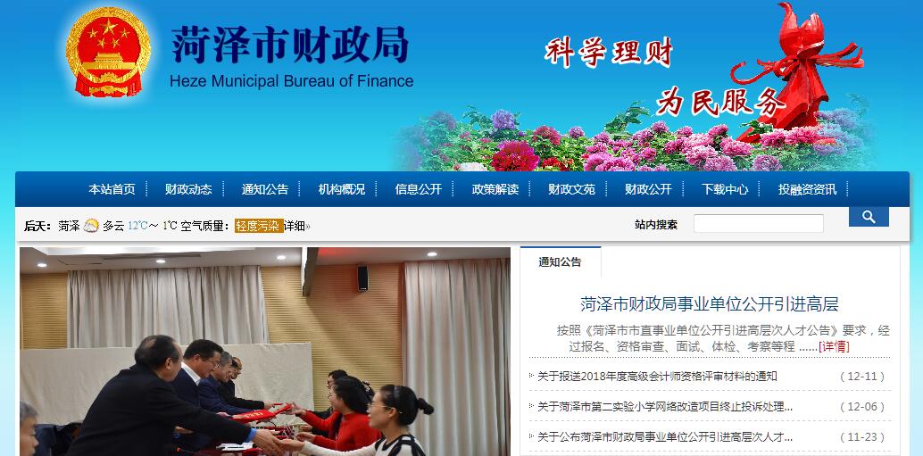 菏泽市财政局主要职责:(一)贯彻执行国家和省财政、税收、相关国有资产管理的方针政策和法律法规,拟订全市财政、税收、相关国有资产管理的规范性文件和财务会计制度并组织实施。(二)根据国民经济和社会发展规划,拟订全市财政、税收、相关国有资产管理的中长期规划及改革方案;分析预测宏观经济形势,参与拟订有关宏观经济政策;提出运用财税政策实施宏观调控和综合平衡社会财力的建议;拟订市与县(区)及国家与企业的分配政策;完善鼓励公益事业发展的财税政策。(三)承担市级各项财政收支管理的责任。负责编制年度市级预算草案并组织执行,汇总全市财政决算;受市政府委托,向市人民代表大会报告市级和全市预算及其执行情况,向市人大常委会报告决算;组织制定经费开支标准、定额,负责审核批复部门(单位)的年度预决算;完善转移支付制度。(四)负责全市税政管理工作;负责财税法规的宣传教育,提出补充、修改、完善财税法规的建议。(五)负责政府非税收入管理,会同有关部门审批或申报行政事业性收费的立项;负责政府性基金、行政事业性收费征收管理;管理市级预算外资金和财政专户;管理财政票据;制定彩票管理政策和有关办法,管理彩票市场和彩票资金。(六)组织制定国库管理制度、国库集中收付制度,指导和监督市级国库业务,按规定开展国库现金管理工作;负责制定政府采购制度并监督管理。(七)负责制定全市行政事业单位国有资产管理制度,按规定负责行政事业单位国有资产管理工作;负责对国有资产收益的收缴入库进行监督;制定需要全市统―规定的开支标准和支出政策并组织实施。(八)负责审核和汇总编制全市国有资本经营预决算草案,制定国有资本经营预算的制度和办法;制定并组织实施企业财务管理制度;按规定承担地方金融类企业国有资产管理有关工作;参与拟订企业国有资产管理相关制度;按规定管理资产评估工作。(九)参与拟订市级建设投资的有关政策.制定基本建设财务管理制度;负责对政府投资项目的财政性资金进行监督管理和跟踪问效;负责有关政策性补贴和专项储备资金财政管理工作。(十)会同有关部门管理市级财政社会保障和就业及医疗卫生支出,会同有关部门拟订社会保障资金(基金)的财务管理制度;编制市级社会保障决算草案。(十一)拟订地方政府性债务管理的制度和办法;承担外国政府和国际金融组织贷款的管理工作;管理财政预算内行政机构、事业单位和社会团体的非贸易外汇;开展财税领域的国际交流与合作。(十二)负责管理全市的会计工作,监督和规范会计行为,制定并组织实施会计制度;指导和监督有关经济鉴证类中介机构及其从业人员的业务活动;承担会计专业技术资格管理有关工作;负责市直会计委派工作,对县(区)会计委派工作进行指导监督。(十三)负责全市农业综合开发管理工作。(十四)指导和推动全市农村综合改革。(十五)监督检查财税法规、政策的执行情况,检查反映财政收支管理中的重大问题,提出加强财政管理的政策建议。(十六)承办市委市政府交办的其他事项。
