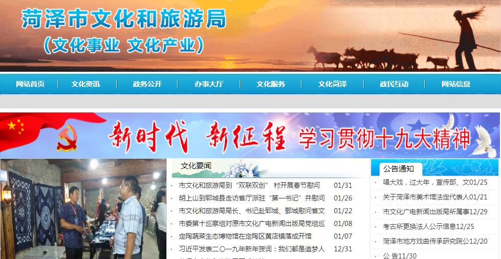 菏泽市文化和旅游局主要职责:(一)贯彻执行国家和省关于文化广电新闻出版、文物保护的方针、政策和法律、法规、规章,拟订相应的政策和规范性文件并组织实施。(二)拟订全市文化广电新闻出版事业发展规划并组织实施,推进本领域的体制改革。(三)指导、管理全市文学艺术事业,指导艺术创作与生产,推动各门类艺术的发展;指导、协调全市性重大文化艺术活动。(四)组织推进全市公共文化服务;规划、引导公共文化产品生产,指导全市重点文化设施和基层文化设施建设。(五)拟订全市文化广电新闻出版产业政策和发展规划;指导、协调相关产业发展。(六)拟订全市非物质文化遗产保护规划,组织实施非物质文化遗产保护和优秀民族文化的传承普及工作。(七)指导、管理全市社会文化事业;指导全市图书馆、博物馆、艺术馆、文化馆(站)事业和基层文化建设。(八)拟订全市文化市场发展规划并组织实施;负责全市文化艺术经营活动和新闻出版单位行业监管;负责监管从事演艺活动、广播电影电视节目制作和新闻出版活动的民办机构。(九)负责对网吧等互联网上网服务营业场所实行经营许可证管理;负责网络游戏服务管理工作。(十)拟订全市动漫、游戏产业规划并监督实施;指导、协调动漫、游戏产业发展。(十一)负责全市广播影视社会管理相关工作。(十二)负责图书发行和印刷复制业的管理工作;拟订全市古籍整理出版规划并组织实施;负责全市新闻单位记者证、国内报刊社驻我市记者站的申报、管理工作;负责全市著作权管理工作;负责互联网出版活动和开办手机书刊、手机文学业务的审核和监督工作。(十三)拟订全市文化广电新闻出版科技发展规划并监督实施;推进本系统科技信息化建设。(十四)管理对外文化工作;参与对外文化宣传和对港澳台的文化交流工作,组织实施对外文化交流活动。(十五)负责管理全市文物事业。(十六)承办市委、市政府交办的其他事项。