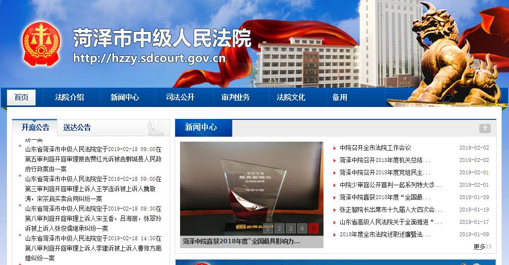 菏泽市位于山东西南部,与江苏、河南、安徽三省接壤,辖牡丹区、曹县、定陶区、成武、单县、巨野、郓城、鄄城、东明七县两区和一个省级经济开发区,人口1019万,面积12239平方公里,是我国著名的牡丹之乡、戏曲之乡、武术之乡和书画之乡。菏泽市中级人民法院始源于新中国成立以前。1948年9月,人民解放军解放菏泽城,现菏泽地区辖区分属冀鲁豫区行署第二、五行政督察专员公署管辖。第二、五行政督察专员公署及各县政府设立司法科,从事司法工作,属冀鲁豫人民法院辖区。1949年8月,平原省建立,同年9月,设立平原省人民法院菏泽分院,由包括院长、副院长在内的6人组成,辖菏泽、东明、曹县、郓城、定陶、鄄城、梁山、南旺八县,同时设立平原省人民法院湖西分院,辖单县、巨野、复程、金乡、嘉祥、鱼台七县,从事现菏泽辖区内的人民司法工作,是为起源。1950年1月,为紧缩全省编制,平原省人民法院湖西分院并归菏泽分院。1951年4月,平原省人民政府决定恢复菏泽、湖西建制,菏泽分院与湖西分院分设。1952年11月,中央决定撤销平原省建制,菏泽、湖西两个专区划归山东省,平原省人民法院菏泽分院改称山东省人民法院菏泽分院。1953年7月,湖西专区撤销,原平原省人民法院湖西分院所辖单县、巨野、成武、复程四个县法院转归山东省人民法院菏泽分院管辖。1955年4月,山东省人民法院菏泽分院改称山东省菏泽地区中级人民法院。1958年11月,菏泽、济宁两个专区合并为济宁专署,菏泽地区中级人民法院建制被撤销。1959年6月,菏泽专区恢复,菏泽地区中级人民法院随之恢复。1966年9月至1968年2月,菏泽地区各级人民法院受“文化大革命”影响,由内部群众掌权,停止正常工作。1968年2月,菏泽“公检法”实行“军管”,成立地区公安机关军事管制委员会,全区各级人民法院实际被取消。1973年4月,菏泽地区公安机关军事管制委员会撤销,菏泽地区中级人民法院恢复办公,同时设立党的核心小组。1977年10月,菏泽地区中级人民法院党的核心小组改为党组。1984年,菏泽地区中级人民法院院长职级配备由正处级升格为副厅级。2001年2月,菏泽撤“地”设“市”,菏泽地区中级人民法院改称菏泽市中级人民法院。时至今日,菏泽市中级人民法院历时60余载,历任10位院长,几次分合,几易名称,几经撤建,创业之艰,守业之难,尽在其中。目前,菏泽中院辖牡丹区、曹县、定陶区、成武、单县、巨野、郓城、鄄城、东明和经济开发区法院,共10个基层法院,49处人民法庭。全市法院现有在职法官干警1343人,本科以上占88.9%,其中,菏泽中院在职法官干警212人,均为本科及以上学历,内设机构33个。近年来,全市法院年均审判执行案件7万多件,有力维护了社会稳定,保障了经济发展,促进了社会和谐。艰苦卓绝,奋勇向前,一代代菏泽法院人在历届党组织的坚强领导下,不畏艰辛,无私奉献,用青春和汗水在菏泽这片热土上树立了一座座不朽的丰碑,为菏泽法院事业的全面、健康、可持续发展做出了不可磨灭的贡献。雄关漫道真如铁,而今迈步从头越。2015年新一届菏泽中院党组承载着菏泽两级法院60余载坎坷光辉的历史,秉承“勤奋、务实、创新、卓越”的工作精神,深入开展“法院管理年”、“制度落实年”、“司法改革推进年”、“质效提升年”活动,大力加强审判执行工作和自身建设,各项工作一年一个新台阶,特别是在审判管理、文化建设、职业道德建设、司法公开和信息化建设等方面取得了显著成绩,曾受到最高法院、省法院、市委和市人大领导的多次批示和肯定。近三年来,全市法院涌现出大批先进集体和个人,有168个集体和325名法官受到市级以上表彰。菏泽中院被授予全省“双百”先锋基层党组织、省级精神文明单位、全省司法公开示范法院、节约型公共机构示范单位等称号。单县法院被授予“全国先进基层党组织”、“全国优秀法院”、“全国法院文化建设示范单位”等称号。中院王学忠同志曾获得“全国政法系统优秀党员干警”称号,中院于莉同志曾获得“全国法院先进个人”称号,牡丹区法院郭萍同志曾获得“全国优秀法官”称号等等。前赴后继的菏泽法院人,正用实际行动,续写着菏泽人民法院事业的新篇章!