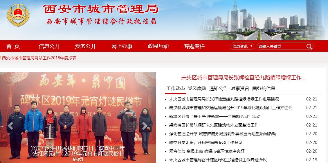 西安市城市管理局主要职责:(一)贯彻执行国家和省、市有关城市管理和城市管理综合行政执法的方针、政策和法律、法规、规章,起草相关地方性法规、规章草案和政策措施。(二)负责编制城市管理发展战略及中、长期发展规划和年度计划,制定行业领域内公共突发事件处置预案,并组织实施。(三)承担组织指导、统筹协调、监督检查、综合考核全市城市管理工作的责任。制定市容环境卫生、城市绿化、户外广告等城市管理方面的管理制度和规范,对全市城市管理方面的重大事项提出处理意见建议,协调解决城市管理重大问题。(四)负责市容环境卫生、园林绿化、户外广告、建筑垃圾等方面的行政审批工作;协调推进城市管理公共服务的市场化、社会化、专业化和产业化发展。(五)负责市容环境卫生行政管理工作;负责城市市容环境卫生配套设施的管理;会同有关部门依法制定环境卫生、市容环境整治收费标准,并负责费用征收;负责城市生活垃圾、餐厨垃圾、建筑废弃物的管理。(六)负责园林绿化和公园绿地管理工作;负责建设项目绿化审批,审查园林绿地建设设计方案,参与竣工验收;组织协调园林绿化和公园绿地重大建设项目实施。(七)负责城市公园、广场综合管理;组织编制城市公园、广场发展规划,监督、指导城市公园、广场的建设和管理。(八)负责户外广告设置管理;依据城市规划,编制户外广告设置规划方案;负责户外广告设置使用权招标、拍卖、转让;承担户外广告设施的安全监管责任。(九)承担全市城市管理相对集中行政处罚权工作。负责城管执法工作的组织实施、业务指导、统筹协调、监督检查和综合考评;负责全市性重大执法活动、专项执法行动的组织和部署,负责跨区域的重大案件的查处;负责研究制定城管执法工作规范和行为规范;负责城管执法工作的业务培训。(十)负责城市规划区范围内的违法建筑物、构筑物日常巡查、监管以及具体行政执法工作。(十一)承担国家卫生城市、园林城市复审和检查工作,巩固创建工作成果;协同有关部门负责环保模范城市创建、文明城市的复审和检查工作。(十二)负责数字化城市管理信息系统建设工作;牵头负责城市精细化管理工作。(十三)负责城市管理和城管执法方面的重点科研项目管理,协调开展重大科研项目创新和攻关;负责相关领域对外合作交流工作。(十四)负责城市管理和城管执法方面的宣传教育工作,协调动员社会力量参与城市管理的相关活动。(十五)承办市政府交办的其他事项。