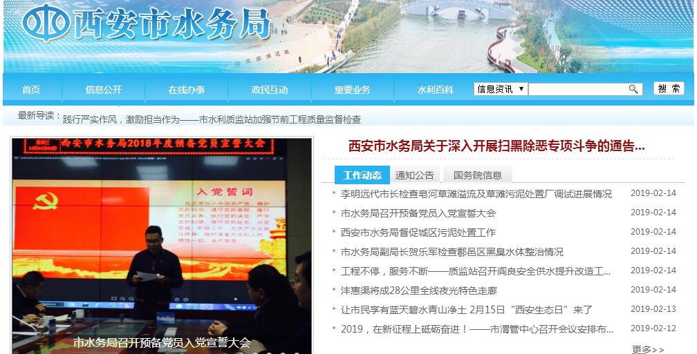 西安市水务局主要职责:(一)贯彻执行有关水行政管理的法律法规和方针政策;起草全市水务行业的地方性法规草案;拟订全市水务、防洪、渔业等工作的发展战略和中长期规划,并组织实施。(二)统一管理全市水资源(含地下水、地表水、空中水)。统筹兼顾和保障生活、生产经营和生态环境用水。拟订全市水中长期供求规划、水量分配方案并监督实施,组织开展水资源调查评价工作,研究提出水价格的建议;负责重要流域、区域以及重大调水工程的水资源调度;组织实施取水许可制度、水资源有偿使用制度和防洪论证制度;保障用水安全,组织拟订水行业技术标准、规程、规范并监督实施。(三)负责全市节约用水工作。拟订节约用水政策,编制节约用水规划,制定有关标准,组织、指导和监督节约用水工作,推动节水型社会建设。(四)负责水资源保护工作。组织拟订水资源保护和开发利用规划;负责水功能区的划分和向饮水区等水域排污控制;检测江河、水库、湖泊的水量、水质,审定水域纳污能力,提出限制排污总量的建议,审批河道排污口的设置和扩大;负责水源保护工作,指导地下水开发利用和城市规划区地下水资源管理保护工作;负责城市供水、污水处理和中水回用的相关管理工作。(五)负责全市水政监察和水政、渔政执法工作,协调、仲裁跨区县水事、渔事纠纷;负责水利行业安全生产工作。(六)指导对全市水利设施、水域和岸线的管理与保护;组织指导全市重要河流、水库、滩涂的治理和开发;组织建设和管理具有控制性和跨区县重要水利工程;对全市水利工程建设进行行业监督和管理;编制、审查水利基建项目建议书和可行性报告;负责全市水利水电工程移民管理工作。(七)负责全市农村水利工作。负责市属水利工程设施和罐区有关管理工作;指导全市农田水利基本建设、农村水能资源开发、农村水电电气化和小水电代燃料工作;指导村镇供水水源管理和农村饮水安全工作。(八)负责防治水旱灾害,承担市防汛抗旱指挥部的具体工作;负责城乡防洪、除涝、抗旱减灾及水库、水电站大坝安全监管工作;组织、协调、监督、指挥全市防汛抗旱;对主要河流和重要水工程实施防汛抗旱调度;负责水利突发公共安全事件的应急管理工作。(九)负责水土保持治理以及水土流失预防、监测和监督执法工作;核发河道采砂许可证。(十)负责全市渔业管理工作。组织编制全市渔业发展规划并指导实施;监督水产品质量,负责水产养殖的科技推广;负责渔业资源及渔业环境的保护;负责全市水生野生动、植物的保护工作;审核、批准出售、收购、利用、经营、运输、出口水生野生动物及其产品活动。(十一)负责水利科技与教育工作;组织开展水利科研技术成果的推广和对外合作与交流;负责水利信息化工作。(十二)承办市政府交办的其他事项。