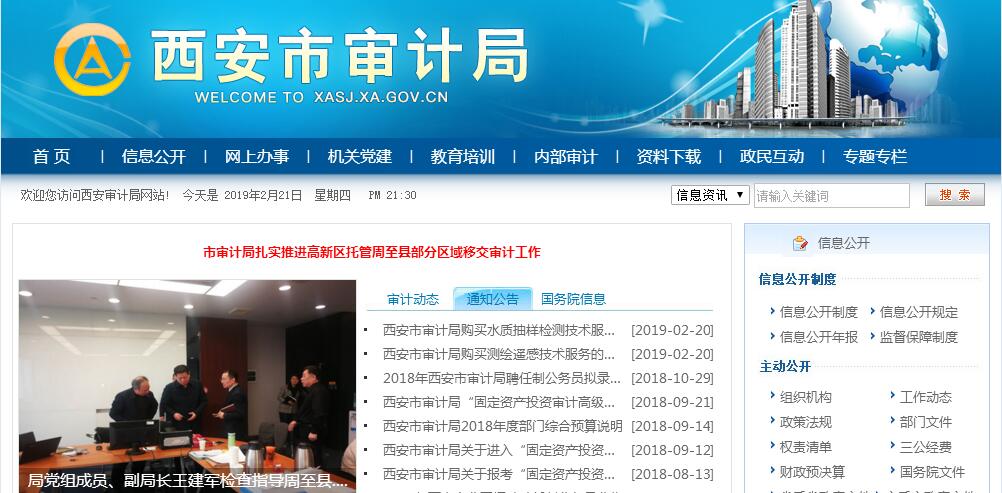 西安市审计局主要职责:(一)贯彻执行有关审计法律法规和方针政策;拟订审计地方性规章并监督执行;制定审计工作发展规划、专业领域审计工作规划和年度审计计划,并组织实施;参与起草地方财政经济及其相关的法规、规章草案;对直接审计、调查和核查的事项依法进行审计评价,做出审计决定或提出审计建议。(二)主管全市审计工作;负责对市级财政收支和法律法规规定属于审计监督范围的财务收支的真实、合法和效益进行审计监督,维护财政经济秩序,提高财政资金使用效益,促进廉政建设,保障国民经济和社会健康发展;对审计、专项审计调查和核查社会审计机构相关审计报告的结果承担责任,并负有督促被审计单位整改的责任。(三)向市长提出年度市级预算执行和其他财政收支情况的审计结果报告;受市政府委托向市人大常委会提出市级预算执行和其他财政收支情况的审计工作报告、审计发现问题的纠正和处理结果的报告;向市政府报告对其他事项的审计和专项审计调查情况及结果;依法向社会公布审计结果;向市政府有关部门、区县人民政府、开发区管委会通报审计情况和审计结果。(四)直接审计下列事项,出具审计报告,在法定职权范围内做出审计决定或向有关主管机关提出处理处罚的建议:1.市预算执行情况和其他财政收支,市级各部门(含直属单位)预算的执行情况、决算和其他财政收支。2.区县人民政府、开发区管委会预算的执行情况、决算和其他财政收支,市财政转移支付资金。3.使用市级财政资金的事业单位和社会团体的财务收支。4.市政府投资和以市政府投资为主的建设项目的预算执行情况和决算。5.市属国有企业和地方金融机构、市政府规定的市属国有资本占控股地位或主导地位的企业和金融机构的资产、负债和损益。6.市政府部门和由市政府委托管理的社会保障基金、社会捐赠资金以及其他有关基金、资金的财务收支。7.国家审计署、省审计厅授权审计的中央、省属单位和各种专项资金及行业。8.国际组织和外国政府援助、贷款项目的财务收支。9.法律、行政法规规定应由市审计局审计的其他事项。(五)按规定对市管领导干部及依法属于市审计局审计监督对象的其他单位主要负责人实施经济责任审计。(六)组织实施对国家财经法律、法规、规章、政策和宏观调控措施执行情况、财政预算管理或国有资产管理使用等与国家财政收支有关的特定事项进行专项审计调查。(七)依法检查审计决定执行情况,督促纠正和处理审计发现的问题,依法办理被审计单位对审计决定提请行政复议、行政诉讼或市政府裁决中的有关事项;协助配合有关部门查处相关重大案件。(八)指导和监督内部审计工作,核查社会审计机构对依法属于审计监督对象的单位出具的相关审计报告。(九)与区县人民政府共同领导区县审计机关;依法领导和监督区县审计机关的业务,组织区县审计机关实施特定项目的专项审计或审计调查,纠正或责成纠正区县审计机关违反国家规定做出的审计决定;按照干部管理权限,协管区县审计机关负责人。(十)指导和推广信息技术在审计领域的应用,组织建设全市审计信息系统,组织计算机审计和审计管理专业培训。(十一)承办市政府交办的其他事项。