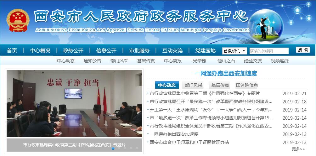 西安市人民政府政务服务中心是市人民政府设立的集中办理本级政府权限范围内的行政许可、行政给付、行政确认、行政征收以及其他服务项目的综合性管理服务机构,也是加强政务服务、提高行政效能,为人民群众提供优质便捷高效服务的重要平台。2008年底市委、市政府决定成立市政务服务中心,2009年4月27日启动运行,2011年1月24日迁入现址(西安市凤城八路95号)。市政务服务中心由中心机关和市级各进驻部门窗口组成。中心机关属市政府直属事业单位,参照公务员法管理,正局级建制。主要职责是负责对各部门进驻审批和服务事项集中办理的组织协调、监督管理和指导服务,对进驻窗口工作人员进行管理培训和日常考核。中心机关编制32人,其中参公编制22名、事业编制10名,局级领导3名、副巡视员1名。内设秘书处、综合协调处、督查处、信息处,下设市重点项目审批代办服务中心;按照《党章》规定,设立了机关党委。进驻部门窗口由各进驻部门首席代表(窗口负责人)和工作人员组成,负责为企业和群众办理纳入市政务服务中心的行政审批和服务事项。目前,共进驻市级部门41个(其中市政府工作部门31个、直属事业单位4个、其它单位6个),以及房地产项目审批改革涉及会签的公共服务机构15个;进驻工作人员311人。进驻事项434项,其中行政许可事项169项、其他行政权力事项265项。市政务服务中心以“依法、便民、高效、公开”为服务宗旨,实行“一个窗口受理、一站式审批、一条龙服务、一个窗口收费”的运行模式。建立健全了审批公开、一次性告知、首问负责、时限承诺等服务制度以及审批清单、首席代表负责、工作AB岗、电子监察、大厅巡查、绩效考核等监管制度,促进了规范审批、高效服务。在审批事项集中办理的基础上,积极探索实行了并联审批、市区两级联动审批、重点项目审批代办服务等工作机制,实现了政务服务工作健康发展。2017年,各进驻部门窗口共办结政务服务事项69458件,较2016年同期减少2.6%。总体审批时限较法定时限平均压缩46.8%,按时办结率100%。中心成立以来,被省委、省政府命名为省级文明单位,被省政府纠风办授予“人民群众满意省级标兵单位”荣誉称号。先后被《人民日报》、新华社《国内动态清样》、《内参选编》、《瞭望》杂志、《光明日报》、《中国纪检监察报》等30家中央和省、市媒体进行表扬性报道400余次。