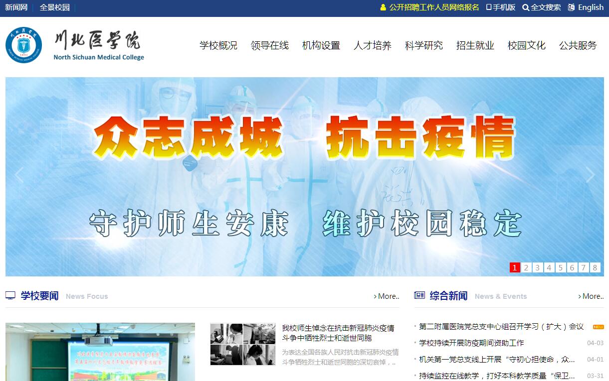 川北医学院坐落在四川省历史文化名城、三国文化发祥地——南充市。学校前身是1951年创办的西南区川北医士学校,1965年升格为专科,1985年升格为本科,定名为川北医学院。学校始终坚持“艰苦奋斗、自强不息”的办学精神,秉承“敬业、博爱、求是、创新”的校训,形成了“以人为本,以质量为生命”的办学思想,确立了“知识、能力、素质”三位一体的人才培养模式,现已发展成为一所以医学为主体,医、文、管、法、工多学科协调发展的省属高等医学院校。学校2005年开始招收留学生,2006年获得硕士学位授予权,2016年获批博士点立项建设单位。现有全日制学生17000余人,其中本科15471人、研究生726人、留学生310人,继续教育校本部学生2818人,形成了“以本科教育为主体,积极发展研究生教育,稳步发展留学生与继续教育”的多层次办学格局。现已成为全国首批“卓越医生教育培养计划”试点建设高校、卫生部腹腔镜手术普外培训基地和四川省医学影像学、临床医学本科人才培养基地,四川省博士后创新培养基地。学校建有南充顺庆、南充高坪两个校区,占地面积1300余亩;学校现有21个教学单位,临床医学等20个本科专业,医学影像学为国家级特色建设专业,医学影像学、医学检验技术、眼视光学和麻醉学专业为四川省特色专业,医学影像学、口腔医学、麻醉学、中西医临床医学、临床医学、眼视光医学为四川省一本招生专业;省级精品课程、省级精品资源共享课程及省级精品在线开放课程共23门次;建有省级实验教学示范中心、虚拟仿真实验教学中心;直管和非直管附属医院24所,教学实习医院55所。学校现有国家中医药管理局中医药重点学科1个、国家临床重点专科1个、国家中医药重点专科1个、四川省重点学科1个、四川省医学重点学科19个。四川省博士后创新实践基地1个、联合培养博士点2个。学校研究生教育包括学术学位和专业学位2个类型:学术学位有基础医学、临床医学、药学、医学技术4个一级学科授权点;专业学位有临床医学、口腔医学、护理学、中医学4个授权类别,涵盖基础医学、临床医学、护理、药学、中医、公共卫生与预防医学和口腔医学7个一级学科的26个二级学科授权点。临床医学进入ESI全球排名前1%行列。有硕士研究生导师418人,兼职博士研究生导师2人。学校研究生教育管理机构健全,奖助学金丰厚,具有研究生培养的良好平台。学校建有医学影像学研究所等12个科研机构,临床免疫实验室等4个国家中医药科研二级实验室,1个四川省重点实验室,风湿免疫与感染免疫实验室等4个省级高校重点实验室,1个四川省人文社科重点研究基地;有四川省科技创新团队2个,四川省高校科技创新团队6个,四川省社会科学高水平研究团队(后备)1个。近年来,先后承担了国家自然科学基金、国家社科基金等各级各类课题900余项,获省部级成果奖30余项,教师学术论文被国际顶级学术期刊《Nature》刊用。学校公开出版刊物《川北医学院学报》为中国科技核心期刊。学校有专任教师1000余名,其中具有博士、硕士学位以上的800余人,教授、副教授高级职称400余人,享受国务院特殊津贴专家、省部级学术技术带头人、四川省有突出贡献的优秀专家、留学归国专家学者近100人。在注重业务素质的同时,学校大力加强师德师风建设和职业素养道德建设,获评为“全国师德师风建设先进集体”。学校于2007年通过了教育部本科教学工作水平评估获得优秀;2017年,顺利接受了本科教学工作审核评估。学生连续数年在全国大学生课外学术科技作品竞赛、全国大学生创业计划竞赛等比赛中获得佳绩,2017年学生获得全国高等医学院校大学生临床技能竞赛全国总决赛二等奖、全国大学生护理技能大赛一等奖等好成绩;本专科毕业生就业率始终保持在95%以上,研究生就业率一直保持100%;学校连续多年被评为“四川省普通高校就业工作先进集体”。同时,学校坚持全员育人、全过程育人、全方位育人,不断推进大学生思想政治教育工作的制度化、规范化。 学校积极加强对外交流与合作,与美国托莱多大学结为姊妹院校,与台湾辅英科技大学、英国斯旺西大学、加拿大萨斯喀彻温理工学院、日本东京女子大学、东盟教育中心等院校和教育科研机构建立了良好的合作关系,积极开展师资培训、科研合作、互派学生等交流活动;招收了来自美国、加拿大、印度、巴基斯坦等17个国家的留学生,开展研究生教育和本科生教育。当前,学校以习近平新时代中国特色社会主义思想为指引,深入贯彻党的十九大精神,全面落实党的教育方针,着力深化综合改革,扎实推进内涵建设,不断提高办学质量,努力把学校建设成特色明显、优势突出、人民满意的区域性高水平医科大学,为推进“健康四川”“健康中国”战略做出新的更大贡献。