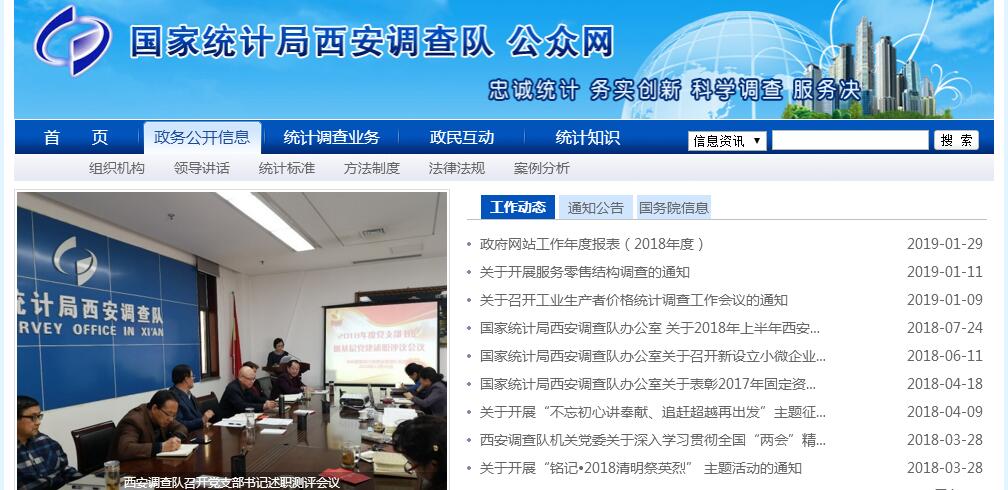| 网站简介: 国家统计局西安调查队是国家统计局的派出机构,为副厅级单位。西安调查队既是政府统计调查机构,也是统计执法机构,依法独立行使统计调查、统计监督的职权,独立向国家统计局和陕西调查总队上报调查结果,并对上报的调查资料的真实性负责。同时,承担地方党委、政府及部门委托的统计调查任务。国家统计局西安调查队主要职责是:1、完成国家统计局布置的各项统计调查任务;2、接受地方党委、政府交办的有关调查任务;3、完成上级调查队交办的各项调查任务;4、协助地方统计局完成重大国情国力普查任务;5、组织指导地方调查队的业务工作;6、受陕西调查总队委托管理西安行政区域内的区县国家调查队;7、负责查处西安调查队组织实施的统计调查中发生的统计违法行为;8、负责调查队机关党的建设、西安调查系统纪检监察和干部管理工作;9、完成国家统计局和陕西调查总队交办的其他事项。国家统计局西安调查队为参照公务员管理的国家事业编制单位,内设11个职能处室;下辖6个区县国家调查队。 |