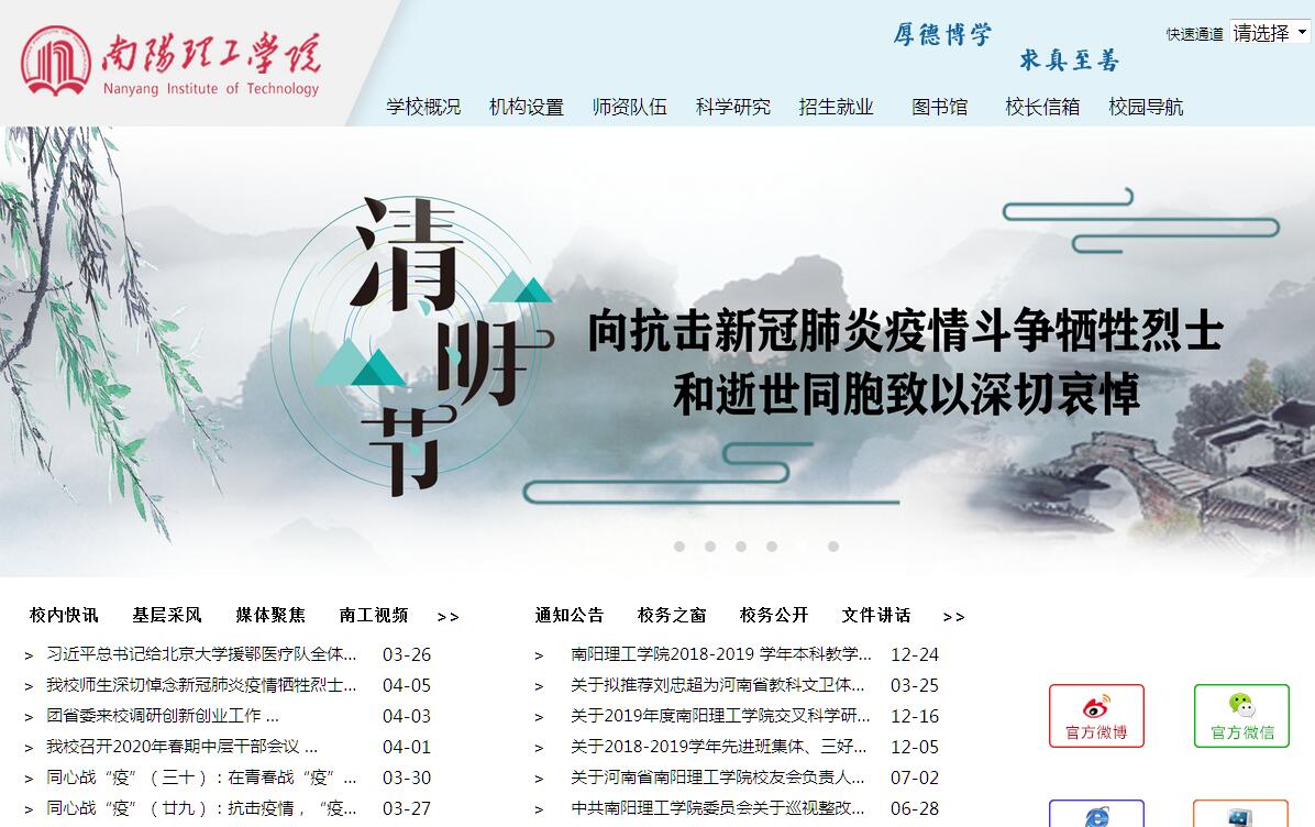 南阳理工学院是全日制公办普通本科院校,位于历史文化名城河南南阳,是商圣范蠡、科圣张衡、医圣张仲景故里,楚风汉韵荟萃之所。学校坚持植根南阳、立足河南、面向全国,走产学研用一体化和开放办学之路,致力于应用型人才培养,先后获批国家应用型本科产教融合工程项目学校100所之一、教育部卓越工程师教育试点学校、全国文明单位、全国绿化模范单位、河南省示范性应用型本科院校10所之一、河南省整体转型发展试点学校、中原经济区最佳服务高校、河南省十大创新创业典范学校,河南省双创基地;拥有国家级众创空间、教育部产教融合创新基地、教育部工程实践基地、省院士工作站、省博士后研发基地、省重点实验室、南阳协同创新研究院、南阳中关村领创空间等一大批科研平台。学校现有19个教学院部,覆盖理、工、管、文、经、教育、法、医、艺术等九大学科,全日制普通在校生和留学生2万余人。学校占地1760亩,建筑面积59万平方米;有大型运动场2个,综合体育馆1座,2012年成功承办第七届全国农民运动会男篮赛事。教学科研仪器设备固定资产总值2.6亿元,拥有1个国家级大学生校外实践教育基地,5个中央财政支持地方高校发展专项资金建设实验室,15个省、市级重点实验室以及实验教学示范中心。馆藏图书137万册,电子图书15000GB,自建有“南工文库”、“仲景文献数据库”、“建筑科学专题库”等特色数据库。主干带宽2万兆、出口带宽4300M的校园网覆盖全校,在全省率先实现大二层扁平化网络架构,有线、无线、IPV4、IPV6统一身份认证,终端计算机21000余台。学校牢固确立人才培养在学校工作中的中心地位,资源配置优先保障人才培养。构建产教融合、校企合作人才培养模式,强化学生创新创业就业能力,致力于为地方经济社会发展培养高素质应用技术型人才。现有普通本专科生和留学生2万余人,其中本科生19252人,来自全国31个省、市、自治区。近年来学生报考率和报到率持续走高,本科二批招生计划全部第一次投档完成。2013年-2016年理科超出省定分数线分别为26分、32分、30分、35分;文科超出省定分数线分别为17分、20分、22分、24分。围绕区域经济社会发展需要,学校坚持“重点做大做强工科,积极发展特色学科,稳步发展应用理科和人文学科”,逐步形成结构优化、特色鲜明、契合地方经济发展需要的专业集群,以本科教育为主,兼有联合培养研究生和留学生教育,以全日制教育为主,兼有继续教育的多层次、开放型办学格局。现有19个教学院部——机械与汽车工程学院、计算机与信息工程学院、电子与电气工程学院、土木工程学院、建筑与城市规划学院、艺术设计学院、经济管理学院、电子商务学院、外国语学院、数学与统计学院、音乐学院、文法学院、生物与化学工程学院、张仲景国医国药学院、软件学院、师范学院、继续教育学院,以及体育教学部、政治理论教学部,50个本科专业。围绕服务南阳先进装备制造、光电信息、电商及物流、“楚风汉韵”古建筑遗存保护、仲景品牌医药等支柱、新兴产业,分别打造机械设计制造及其自动化、材料成型及控制工程;软件工程、光电信息科学与工程;电子商务、物联网工程;历史建筑保护工程、城乡规划;中医学、中药学等一批核心专业集群,逐步形成产业群、专业群、人才链与南阳经济社会发展的紧密对接。目前拥有9个教育部、省教育厅“卓越计划”试点专业,16个省级重点学科、特色专业以及专业综合改革试点,10门国家级、省级精品课程以及精品资源共享课程。学校坚持“高起点、分步走、双师型、可持续”的教师队伍建设指导思想,培养与引进相结合、专职与兼职相结合、理论教师与实践教师相结合、学校教师与企业工程师相结合,建设一支结构合理、素质优良的专业化教师队伍。现有教职工1500余人,其中高级专业技术职务教师560人,博士、硕士学位教师938人。拥有河南省优秀专家、省政府特殊津贴专家、省学术技术带头人、省教育厅学术技术带头人22人,建设有20个省、校级创新型科技团队和教学团队,设有“河南省博士后研发基地”,聘请多位两院院士、知名专家学者为兼职教授。学校坚持“教学为重,教学与科研并举,以教学带动科研、以科研服务教学质量”的理念。鼓励教师将最新科研成果应用到教学实践,促进教学内容更新,形成科研与教学的良性互动。近3年立项科研项目412项,其中国家级6项、省部级208项;鉴定各级各类科研项目375项;地厅级以上科研成果获奖150项;承接横向课题51项;公开发表论文2600余篇;出版专著、译著16本,主参编教材100余部。主办的《南阳理工学院学报》国内外公开发行,影响力不断提高。学校坚持产教融合、校企协同育人,主动适应地方需要,深入实施创新驱动、应用驱动、实践驱动发展战略,为地方经济社会发展提供人才和科技支撑。成立有河南省制造业信息化服务中心、南阳协同创新研究院、张仲景国医研究院、建筑设计研究院、结构仿真与设计研究所和光电技术研究所。建立南阳高校第一个院士工作站——河南省水资源与生态环境保护院士工作站;组建南阳电商联盟,先后被授予省、市“电子商务人才培训基地”、“电商继续教育基地”、“电子商务示范基地”。与美国通用电气、德国博世、长城计算机等共建多个实验室,与中