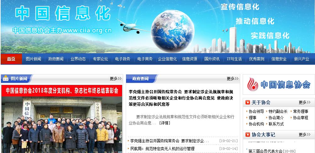 中国信息化网由中国信息协会主办。中国信息协会是1989年4月经民政部批准成立,由经济、科技、社会等领域从事信息工作的团体和个人自愿组成,具有社团法人资格的全国性社会团体,是信息行业的非营利性中介服务组织,接受登记管理机关中华人民共和国民政部和业务主管单位国家发展和改革委员会的业务指导和监督管理。中国信息协会由国家发展和改革委员会主管,接受民政部的管理和监督,业务工作接受工业和信息化部的指导,办事机构依托国家信息中心。中国信息协会的宗旨是:坚持走中国特色信息化发展道路,以信息化驱动现代化为主线,以建设网络强国为目标,着力增强国家信息化发展能力,着力提高信息化应用水平,着力优化信息化发展环境,严格遵守宪法、法律、法规和国家政策,提倡良好的社会道德风尚,组织会员单位,动员社会力量,发挥非营利性社会中介服务组织的职能作用,共同推动我国国民经济和社会信息化事业的发展。中国信息协会的任务是:以推进国民经济和社会信息化为中心,以促进信息技术的发展,信息资源的开发,信息交流和知识共享的提升,信息化应用的深化为重点,坚持履行“自律、维权、协调、服务”职能,充分发挥社会组织服务国家、服务社会、服务群众、服务行业的作用,搭建政府与企事业单位、政府与公众之间的桥梁,受政府部门委托协调信息化工作,积极反映行业、会员的合理诉求,努力成为独立公正、按市场化原则规范运作的服务机构和自律性组织。中国信息协会的业务范围是:宣传国家有关信息化工作的方针政策、法律法规,组织研究我国信息化的发展战略、管理体制等,向政府和有关部门提出建议;接受国家有关部门授权或委托,推动信息立法、信息标准化、信息安全和认证、信息资源开发利用等基础工作的开展,参与相关法律法规、部门规章、发展规划、行业标准和规范、行业准入条件及收费标准的研究制定工作,依法参与行业资质管理等相关工作,积极组织有关单位推广和应用信息技术;组织分支机构、会员单位和社会力量,对信息化及其相关领域的理论和实践问题进行研究、探讨和交流,推进重点领域和产业的信息化进程;组织对信息产业和信息服务体系基本情况的市场研究,向政府主管部门反映其发展中的突出问题,并提出相关对策和建议,组织和推动相关企业开展业务交流和研讨活动;在法律规范和政府有关部门指导下,制订并组织实施行业职业道德准则等行规行约,推动行业诚信建设和廉洁管理,建立并完善行业自律和约束机制,规范会员行为,维护公平竞争的市场环境;开展信息化领域科技成果转化工作,促进信息化领域的产、学、研结合;依照国家有关规定,建设好相关网站,编辑出版行业杂志报刊和资讯材料,开展行业宣传和信息服务;组织开展信息技术、信息经济、信息管理和信息服务等方面的业务、资格培训,提高从业人员素质和业务水平;调解或配合有关方面调解涉及本行业的纠纷和矛盾,向政府及有关各方反映会员的合理意见和建议,维护和增进本行业及会员的正当权益。按照有关规定,开展中国信息化成果评选等活动,进一步发挥广大信息化工作者开拓创新的积极性,为信息化推进工作提供一个高质量、高标准的平台。承担各级政府和有关部门以及企事业单位委托的有关信息化工作方面的研究、咨询、评估、评审工作;建立与相关国际机构、港澳台地区相关机构的联系,促进境内外信息合作与交流。中国信息化成果评选项目是经中共中央、国务院同意,监察部会同国务院纠风办、中央编办、国家发改委、民政部、财政部、人事部、国资委、法制办等九部委于2009年12月30日批准行政系统中央单位保留的377个评选项目之一,该项目是我国信息化领域唯一保留的评选项目,九部委责成中国信息协会主办。中国信息协会现有分支机构24个,即城市分会、民营企业分会、能源分会、投融资信息分会、大数据分会、通用航空分会、城市运营分会、教育分会、量子信息分会、数字经济专业委员会、信息服务网络委员会、市场研究业分会、信息化促进工作委员会、电子政务专业委员会、信息安全专业委员会、信用专业委员会、信息技术服务专业委员会、自然资源和地理空间信息专业委员会、法律分会、医疗卫生和健康产业分会、电商智慧物流产业分会、军民融合专业委员会、人工智能分会、云计算技术专业委员会。我国32个省、自治区、直辖市和15个副省级城市省市均设立了地方信息协会,地方信息协会与中国信息协会保持着经常性的业务联系,形成了全国信息行业组织网络。中国信息协会主办的期刊有:《中国信息界》、《中国会展》、《中国科技投资》、《中国产经》;内部刊物《信息化参考》。中国信息协会官方网站:中国信息化网 网址:http://www.ciia.org.cn