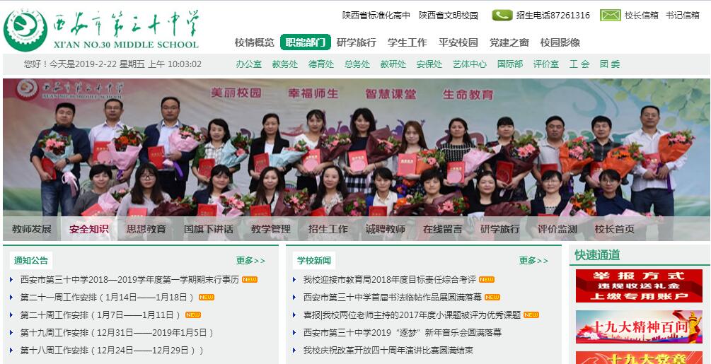 在这座古老而文明,有着悠久历史和文化底蕴的古城西安,坐落着这样一所学校——西安市第三十中学。她地处龙脉之地,钟楼脚下,交通便捷,位于省市政府间之要道,环境优雅、教学设施齐全,是莘莘学子放飞梦想的好去处;更是学子们修身治学的读书胜地。这里曾培养了国际著名导演张艺谋、著名作曲家赵季平、文职将军左青,著名歌唱家任慧等一大批在国内外享有盛誉的艺术家。在半个多世纪的办学历程中,她为国家培养了一批又一批优秀人才。她是西安教育的窗口,三十中始终没有忘记社会赋予她的这一神圣使命——发现人才,培养人才,尊重人才。西安市第三十中学,创建于1941年,历经73年的风雨磨砺,三秦大地、巍巍钟楼见证了三十中的岁月变迁和长足发展。近几年,学校在特色教育方面取得了辉煌的成就,升学率逐年提高。学校发展的思路:一是进一步提高学校核心竞争力,走特色教育之路;二是不断加强学校制度建设、队伍建设、文化建设,使学校时刻焕发着生机和活力;三是要有一种主人翁精神,以人为本,让老师能够真心把学校当成自己的家,把学生当成自己的孩子,使老师有种幸福感和归属感;四是为每个学生提供一个发展的空间和施展个人才华的舞台,使学生真正感受到学习的快乐和乐趣。这样的定位为三十中以后的发展打下了坚实的基础,指明了前进的方向,将使学校在创办一流特色学校的路上走的更稳、更快、更好。三十中在这几年的发展历程中,不断探索教育规律、更新教育观念、明确学校改革和发展的总体思路,成功提炼出“崇德、明志、积学、躬行”八字校训;进一步明确了“立德树人,和谐发展”的办学理念。校长阎春喜认为,一个人要成才先成人,合格首先是做人的合格。因此学校必须全面贯彻党的教育方针,全面推进素质教育,在学问合格与做人合格的关系上首先重视做人的合格。30中理应把全体学生培养成为爱国的具有社会公德、文明行为习惯的遵纪守法的好公民,教会学生起码的做人准则,做一名合格的中学生,而三十中目前就是这样一步一步做的。每当中午放学,当北大街十字红灯亮起来时,三十中的学生整齐地停在禁行线外,能够严格遵守交通管理规定;公交车上给老弱病残孕让座时也能看到三十中学生的身影,他们时刻为别人着想;到学校来访的客人也能听到三十中学生一声亲切的问候,他们以一种主人翁的精神笑迎八方来客。这就是三十中的学生,他们尊重别人,懂得做人,知道怎样去做人。一所学校要取得长足的发展,就要有自己的长处,要有自己的特色。三十中作为省级艺术教育特色学校,始终坚持这样的优势,走自己艺术教育特色之路。多年来,学校歌舞艺术团多次代表省、市参加全国调演,屡获国家、省、市金银奖,向北影、北广、西安交大、西工大、陕师大、厦门大学、西安音乐学院等高校以及各级各类艺术团体输送了一批又一批艺术特长生。三十中坚持“重点+特色、合格+特长”的办学思路,积极适应社会需求,着力提升学校综合实力,努力彰显办学特色和优势,取得引人瞩目的成绩。学校先后获得陕西省文明校园、陕西省标准化高中、陕西省艺术教育示范学校、陕西省依法治校示范校、西安市建设学习型企(事)业活动先进集体、陕西省模范职工之家、西安市思想政治工作先进集体等多项荣誉,得到上级主管部门和社会各界的高度赞誉。“社会对基础教育的需求,根本在于能够为不同发展潜质的孩子提供适合其发展的教育。适合的教育,才是好的教育。三十中不断坚持艺术教育传统,推进学科结构调整,为学生特长发展创造机会,搭建平台,营造氛围,在特色中追求教育教学质量,在发展中实现办学目标。”三十中新一任领导上任伊始,就把创建一流特色学校,提高学校核心竞争力作为办学目标,经过不断探索和实践,形成了“知礼、和谐、求是、进取”的校风, “敬业、爱生、博学、善导”的教风和“守纪、尊师、勤奋、善思”的学风。这使学校领导班子充分认识到,只有将全体师生关心、关注的问题解决好,才能保证学校的又好又快发展。在制度建设方面,学校把校长治校、制度治校、文化治校,作为制度建设的三个阶段。建立健全了教师管理、学生管理、德体美管理、课外活动管理、总务管理,教育科研管理制度。三十中在制度的实施过程中,领导和老师能够身先士卒,使学生深切感受到领导和老师已融入到他们这个集体。一位学生在给校长的信中写到, “每当早上做操时,都能看见后面的老师也在做,我觉得真的很好,老师们和我们一起做操,我们的积极性都被带动起来了,大家都比以前要认真了。那天看到校长也在做操,感觉好亲切啊,您做得很认真。我希望能让老师们天天和我们一起做操,一来大家的积极性被带动,二来还能增加你们的亲切度呢”。建设学习型学校和高素质师资队伍是一所学校前进的动力和源泉,三十中铸就了一支以十余位省、市级骨干教师为代表的师德高尚、业务精良、锐意进取、甘于奉献的教师队伍。学校特别注重班主任队伍的建设,通过班主任工作研讨会和班主任业务知识培训等行之有效的方式,培育了一支以六名省、市级优秀班主任为代表的高素质班主任队伍。他们用爱心和责任心诠释着教师职业的崇高和伟大,这些老师以先进的教育理念,一流的教学业绩,不断在三十中施展着自己的