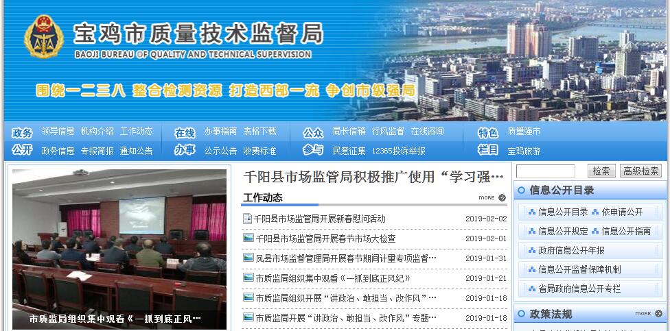 宝鸡市质量技术监督局主要职责:(一)贯彻执行质量技术监督工作方面的法律法规和方针政策,拟订有关规范性文件,并组织实施。(二)统一管理和指导全市产品质量工作,推进产品质量诚信体系建设;负责质量宏观管理工作,组织推进质量振兴工作,推进名牌发展战略;会同有关部门组织实施重大工程设备质量监理制度。(三)负责产品质量安全监督工作。管理产品质量安全强制检验、风险监控、监督抽查、地理标志产品保护工作;组织开展产品质量安全专项整治工作;参与重大产品质量事故调查;组织实施缺陷产品召回制度;监督管理产品防伪工作;组织协调全市有关专项打假活动。(四)统一管理全市标准化工作。贯彻执行国家标准和行业标准并监督实施;组织制定、修订、审批、发布市级农业地方标准规范;管理企业标准备案、标准登记;管理采用国际标准和国外先进标准工作并监督贯彻执行;管理全市组织机构代码和商品条码工作。(五)统一管理全市计量工作。组织推行法定计量单位和国家计量制度;组织实施量值传递和强制检定以及计量校准工作,负责规范和监督全市商品量和市场计量行为。(六)统一管理全市认证认可工作。依法监督和规范认证市场,依法对为社会出具公正数据的检验机构进行监督管理。(七)承担特种设备安全监察、监督工作。对特种设备使用环节进行行政许可及监督检查;负责特种设备作业人员资格考核、发证及监督管理工作;按规定权限组织特种设备事故的调查处理。(八)依法查处产品质量、计量、标准化、认证认可和特种设备等方面的违法行为;打击假冒伪劣产品违法活动;负责全市质量技术监督投诉、申诉和举报工作。(九)负责全市工业产品生产许可证、能效标识和纤维质量监督管理;监督检查高耗能特种设备节能标准的执行情况。(十)组织协调行业和专业的质量技术监督工作;制定并组织实施质量技术监督科技发展规划和技术机构建设规划。(十一)承办市政府交办的其他事项。