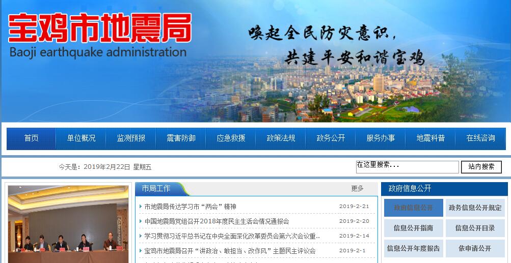 陕西省宝鸡市地震局是市人民政府管理全市防震减灾工作的直属单位,承担《中华人民共和国防震减灾法》和《陕西省防震减灾条例》赋予的行政执法职责。成立于1977年6月,机关设政秘科、监测预报科、震灾防御科,下属陇县地震观测台、上王地震观测台及汤峪地震观测台。宝鸡市防震减灾工作领导小组办公室设在市地震局。其主要职责:1、贯彻执行国家和省政府制定的防震减灾工作的方针、政策,负责管理本行政区域内的防震减灾工作。负责起草地方性规章,制定规范性文件,并组织实施。2、组织制定本行政区的防震减灾事业规划和计划,并组织实施;管理监督事业费、基本建设费和专项资金的使用。3、负责管理本行政区地震监测预报工作,制定地震监测预报方案并组织实施;管理本行政区监测台网(站)和群测群防工作;负责提出地震趋势意见;会同有关部门依法保护地震监测设施和地震观测环境。4、负责本行政区建设工程抗震设防要求管理工作;依法监督检查一般工民建的抗震设防要求;管理地震安全性评价工作,审定重大工程的抗震设防要求;管理本行政区内的地震灾害预测;制定破坏性地震应急预案并检查落实情况。5、承担在破坏性地震发生后市政府抗震救灾机关办事机构职责;负责震情速报和地震灾情速报,参与地震灾害调查与损失评估;参与制定地震灾区重建计划。6、推进地震科技现代化,组织开展地震科学技术研究及其成果的推广应用;指导和管理与防震减灾事业有关的学会、协会工作。7、会同有关部门开展防震减灾教育宣传报道。8、指导县区防震减灾工作。