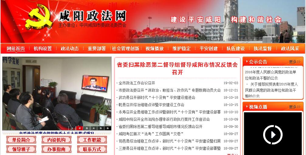 咸阳政法网由咸阳市委政法委员会,咸阳市社会治安综合治理办公室,咸阳市委维护社会稳定工作领导小组办公室主办。咸阳市委政法委员会主要职责:(一)根据党中央的路线、方针、政策和省市委的部署,统一政法各部门的思想和行动。(二)对一定时期内的政法工作作出全局性部署,并督促贯彻落实;(三)组织协调指导维护社会稳定工作,收集汇总分析综合治理工作信息资料。(四)检查政法部门党的路线、方针、政策和法律法规执行情况;结合实际,研究制定落实党的方针政策、严格执法的具体措施。(五)大力支持和严格监督政法各部门依法行使职权,指导和协调政法各部门在依法相互制约的同时密切配合,督促、推动大案、要案的查处工作,研究、协调有争议的重大嫌疑案件。(六)组织、协调社会治安综合治理工作,制定一个时期全市社会治安综合治理工作规划和实施方案、专项斗争和重点治理方案。(七)组织开展调查研究工作,围绕各个时期综合治理工作的中心工作和重大部署,针对出现的新情况、新问题进行调查研究,总结新经验,解决新问题。(八)研究加强政法队伍建设和领导班子建设的情况,协助组织部门考察、管理政法部门的领导干部。(九)负责协调市社会治安综合治理委员会各成员单位的工作,检查督促基层单位综合治理各项措施的落实。(十)承办市委和上级业务部门交办的其它工作。咸阳市社会治安综合治理办公室职责任务:(一)认真贯彻落实党中央、国务院和中央、省社会治安综合治理委员会制订的社会治安综合治理的方针政策。(二)掌握各县(区市)、市综治委各成员单位社会治安综合治理工作进展情况,及时向委员会反映,提出工作建议。(三)开展调查研究,推动各县(区市)、各成员单位落实综合治理各项措施。(四)总结交流典型经验,表彰奖励先进,处罚、推动后进。(五)办理市综治委交办的其它事项。咸阳市委维护社会稳定工作领导小组办公室职责任务:(一)贯彻落实中央及省、市委维护稳定工作领导小组的指示及工作部署,开展维护稳定工作,加强检查指导。(二)收集、掌握、上报影响稳定的重要信息和情况,对涉及其他地区或部门的问题,及时进行通报,做好有关配合工作。(三)定期分析研究维稳工作的形势,预测发展趋势,提出意见和对策,为市委、市政府决策提供依据。每月向省委维稳办和市委报告一次全市稳定工作综合情况。(四)对不稳定因素组织排查调处,对发现和掌握的突出问题,及时向市委、市政府汇报并向有关部门通报,提出化解矛盾、消除隐患、解决问题的措施建议。每季度向省委维稳办书面报告一次矛盾纠纷排查调处情况。(五)组织协调有关部门做好敏感期、重要活动和重大节庆期间的维护稳定工作。(六)督促指导有关部门制定和完善处置突发性群体事件工作预案。对已发生的突发性群体事件,在市委、市政府领导下,组织协调有关部门及时妥善处置,并及时上报情况。(七)组织协调有关部门对影响社会稳定的重大情况和突出问题进行专题研究,提出解决问题的对策和建议。(八)加强制度化、规范化建设,完善信息报送、排查调处、组织协调和检查督办等各项维护稳定工作机制,强化维护稳定工作责任制。(九)对全市维护稳定工作情况及领导干部履行维护稳定工作责任制和中、省维稳办交办的工作完成情况进行监督检查;会同有关部门对发生严重危害社会稳定问题的地方、部门、单位和责任人实施责任查究。(十)承担市委维护稳定工作领导小组日常工作,完成省委维护稳定工作领导小组及其办公室交办的其他工作任务。