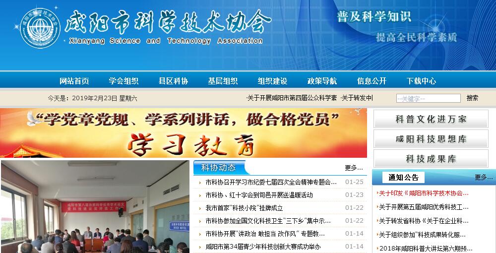 咸阳市科学技术协会(简称咸阳市科协)是咸阳市科技工作者的群众组织,是中共咸阳市委领导下的人民团体,是党和政府联系科学技术工作者的桥梁和纽带,是咸阳市发展科学技术事业的重要力量。咸阳市科学技术协会的宗旨是:高举邓小平理论伟大旗帜,团结和动员全市科技工作者,以经济建设为中心,以提高全市人民的科学技术文化素质为已任,面向生产、面向基层、面向群众、面向未来,坚持科学技术是第一生产力的思想,实施科教兴咸和可持续发展战略,促进科学技术的繁荣和发展,促进科学技术的普及和推广,促进科学技术人才的成长和提高,促进科技与经济的结合,为社会主义物质文明和精神文明建设服务,为市委、市政府中心工作服务;反映科学技术工作者的意见、要求和呼声,维护科学技术工作的合法权益,为科学技术工作者服务。把科协办成科技工作者之家。咸阳市科协由全市性自然科学、技术科学、工程技术及其与社会科学相交叉的边缘学科组建的学会、协会、研究会(以下简称学会)和县(市、区)科协、辖区中、省、市企事业单位科协组成,是陕西省科协的地方组织,推荐代表参加省科协代表大会,业务上接受省科协的指导,执行省科协的决议。科协主要任务:1 、参与制定全市科普工作规划和年度计划;负责市级自然科学学会(协会、研究会)的审批、管理,开展学术交流,活跃学术思想,提高学术水平。2 、履行人民团体参政、议政的社会职能,参与科技政策、办法的制定和地方事务和政治协商、民主监督工作。3 、参与党和政府对重大科技、经济、社会问题的决策论证,提出政策性建议;开展技术咨询服务,兴办科技实体,接受委托承担项目评估、成果鉴定、技术开发、技术转让、技术职务资格评定等任务。4 、指导县区市科协及企事业单位科协、乡镇科普协会、农村专业技术协会、研究会的科普工作。5 、弘扬科学精神,传播科学思想、科学方法,宣传普及科学技术知识,推广实用技术,组织“科技之春”宣传月等重大科普宣传活动;参与组织、评选和表彰“十佳 科普明星”工作。6 、加强科技活动阵地建设;维护科技工作者合法权益,为科技工作者服务,把科协办成科技工作者之家。7 、负责咸阳市优秀科技建议奖的评审,参与表彰市级有突出贡献的科技工作者,举荐人才,弘扬“尊重知识、尊重人才”的社会风尚。8 、加速科技成果转化,开展科技人员继续教育和技术培训工作。9 、开展国际科技交流,发展同国外科技团体和科技工作者的友好交往,负责向国外选派专业研修生、访问学者的选拔推荐工作。10 、加强与市内外科技团体的联系,促进自然科学与社会科学的结合。11 、承办市委主办的其它工作。