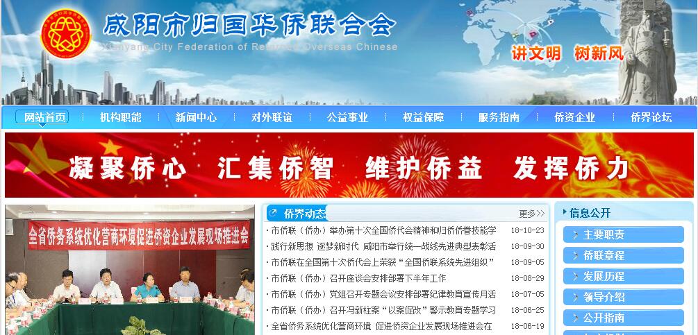 根据省委、省政府批准的《咸阳市市级机构改革方案》,咸阳市归国华侨联合会是在市委领导下由归侨、侨眷组成的群众团体;咸阳市侨务办公室是市政府主管侨务工作的职能部门。其主要职责:1.宣传贯彻党的侨务工作方针、政策,积极参政、议政,协助党和政府制定有关侨务工作政策,反映侨界的意见和要求,发挥民主监督作用,促进社会主义民主和法制建设。参与协商和推荐归侨、侨眷人大代表、政协委员人选。2.依法保护归侨、侨眷的合法权益,为他们提供政策咨询和法律咨询服务。3.调查研究全市侨务工作情况,了解掌握我市海外侨情,特别是华侨、港澳同胞、外籍华人重点人的情况,发挥广大归侨、侨眷与海外联系广泛的优势,多形式、多渠道联络感情,增进友谊,促进我市与海外侨胞及社团的经济、科技、文化交流与合作。4.引导和协助海外侨胞、港澳同胞来咸投资办厂,支持他们兴办文化、科技、卫生事业及其他社会公益事业。积极扶持侨属企业,办好侨联所属经济、文化实体,努力做好招商引资、招贤引智和爱国主义、科技兴国等基地建设工作。5.开展与海外侨胞、外籍华人及其社团的友好联谊,做好接待服务工作;鼓励、引导和教育归侨、侨眷发扬爱国主义精神,努力促进祖国统一,维护世界和平。6.审理海外侨胞捐赠工作;会同有关部门保护侨汇、研究改革侨汇商品供应;负责侨资企业的认证工作。7.协助培养、推荐和选拔德才兼备的归侨、侨眷干部。8.负责归侨、侨眷身份认定工作;负责华侨、港澳同胞、外籍华人、归侨和侨眷的来信来访工作;配合有关部门做好归侨、侨眷、海外华人出入境和来咸定居安置有关审核审理工作。9.承办市委、市政府和上级业务部门交办的其他工作。