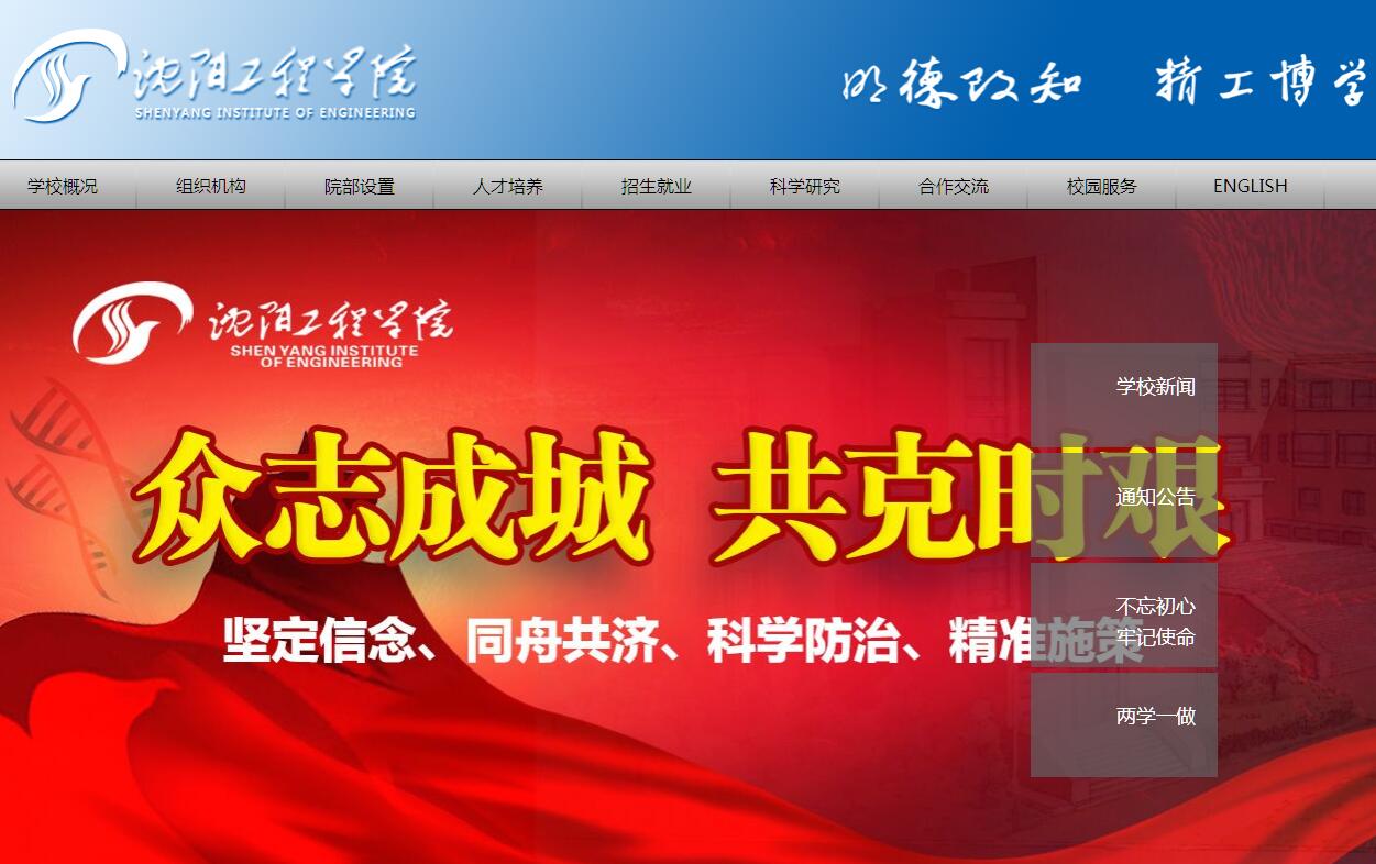 沈阳工程学院是一所以工为主,工、理、经、文、管、法等学科协调发展的多科性高等院校,是辽宁省人民政府与国家电力投资集团共建的省属重点本科院校,是辽宁省内唯一一所以能源电力为主干学科的地方本科高校,是“辽宁省普通本科高等学校向应用型转变示范高校”。学校始终保持95%以上的较高就业率,办学模式和人才培养质量得到社会广泛认可,获评“教育部全国毕业生就业典型经验高校”。学校位于辽宁沈阳沈北新区,现有主校区、科技园区和产业园区,占地面积近86万平方米,建筑面积近46万平方米。面向全国29个省(市、自治区)招生,现有全日制研究生、本专科生和留学生11000余人。设有10个二级学院、5个教学部和1个工程实训中心,开设30个本科专业、7个专科专业。图书馆建筑面积2.14万平方米,馆藏图书百余万册,数字图书馆建设初具规模。校园网以万兆为主干,千兆到楼层,实现教学区、图书馆、学生宿舍区无线网络全覆盖。共享数据平台、统一身份认证平台和统一门户平台上线,实现了教育管理信息互联互通。学校拥有一支结构合理、素质优良的教师队伍。640余名专任教师中,副高级以上教师占43%,具有博士、硕士学位的占86%;“双师双能”型教师占专业教师的80%。拥有省级高校各类教学、科技创新团队11个;有省市各类名师、专家40余人,他们中有国务院特殊津贴专家、全国优秀教师、省级教学名师、省级专业带头人、新世纪百千万人才等各级优秀教师。学校有1个国家级高校特色专业建设点,1个国家综合改革试点专业;1个辽宁省优势特色专业,4个辽宁省综合改革试点专业,2个辽宁省工程人才培养模式改革试点专业,3个辽宁省普通本科高校向应用型转变示范专业。学校现有1个国家级大学生校外实践教育基地,15个省级大学生实践教育基地,94个校内实验实训场所,132个校外实习实践基地。教学科研仪器设备总值约1.46亿元,其中,微电网技术、核电站控制与运行仿真、600MW火电机组运行仿真等10套百万元以上大型实验装置具有行业先进技术水平。学校坚定地走“产教融合、校企合作”发展之路,与国家电投集团等央企、辽沈地区及驻辽驻沈等大型国企签订了全面战略合作框架协议。学校牵头成立“辽宁省能源电力产业校企联盟”,与地方政府及企事业单位签订160余项产学研合作协议,与中航沈飞集团等多家单位实现了“订单式”人才培养。学校以社会需求为导向开展应用技术研究。现有省市级各类重点实验室、研究中心21个。近年来,承担国家自然基金和国家863计划等国家级项目14项、省市级科技项目530项、横向项目160项。获省级以上科研奖励近30项;10余项技术专利成功转让,在电网改造、新能源应用等领域创造经济效益上亿元。学校积极拓展国际合作渠道,先后与加拿大红河学院、澳大利亚莫道克大学、英国格拉斯哥卡利多尼亚大学、西班牙加泰罗尼亚理工大学等20多所国外高校缔结友好合作关系。与澳大利亚莫道克大学合办“电气工程”本科教育项目。中加合办的红河国际学院历经30年合作办学,已成为辽宁省国际教育合作的典范。建校70年来,学校秉承“明德致知、精工博学”的校训精神,坚持“服务电力、服务辽宁,工程教育、应用为本,产教融合、卓尔不群”的办学理念,大力弘扬雷锋精神,坚持以立德树人为根本、以提高质量为核心、以改革创新为动力、以转型发展为路径,培养高级工程技术应用型人才,为社会培养输送了十余万应用型人才。今天,发展中的沈阳工程学院,肩负社会责任,牢记育人使命,正朝着“建设特色学科省内一流、高水平的应用型地方本科院校”的新目标阔步前行!