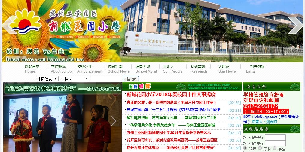 姑苏东郊的金鸡湖畔,矗立着醒目的大型雕塑——“圆融”,两个灵动的圆自然相扣,标志着传统与现代、科技与人文的互融和共生。苏州工业园区新城花园小学紧邻“圆融”,是中新合作开发区内第一所公办小学,是园区素质教育的一张名片,它与古城区的学校具共性,但更显个性,现代化、国际化、特色化教育的特征更明显、更突出。她用自己的眼睛,一个是向外无限拓展自己的视野,一个是向内不断地去丰盈自己的心灵,思辨求索,和而不同!苏州工业园区的入口屹立着一座标志性雕塑,它的名字叫“窗口”,方方的一扇窗,被风掀起的窗帘,让人浮想联翩:工业园区是改革开放的窗口,展示着独特而和谐的魅力。新城花园小学作为园区素质教育的窗口,不仅有现代化的教育教学设备,更有先进的教育理念和高质量的教育教学水平。学校走内涵发展之路,从建校之初,就确立了“教师个体发展和学校整体发展双赢”的培养理念,“教师专业发展共同体” 系列行动打造了一支德艺双馨的教师队伍,他们让课堂绽放生活的魅力,让课堂焕发生命的活力,全面激活课堂教学的“一池春水”,造就了“轻负担高质量”的教学特色,真正让学生的学习生活幸福快乐。步入新城花园小学,随处可见红、黄、蓝三原色组成的“太阳花”,红色象征热情开朗,黄色象征温文尔雅,蓝色象征聪慧睿智。阳光、健康、灵动、美丽的“太阳家族”校园形象系列品牌深入人心。新城花园小学的学生具备与同龄人一样的各种优良品质,但性格更开朗、知识更丰富、做事更自信,大气、胆气、灵气的“太阳娃”处处显示出“地球村村民”的特质。学校“文武”特色两手并重:“书香校园”造就了“太阳娃”的文化气质,“轮滑特色”迸发出“太阳娃”的阳光活力。刚刚走过19年发展历程的新城花园小学,秉持开放的办学理念,融合多元文化,在人本关怀中成长,在文化熏陶中跨越,成就了爱意浓浓的“心灵家园”、个性健康的“人性乐园”、人文凸显的“文化圣园”。