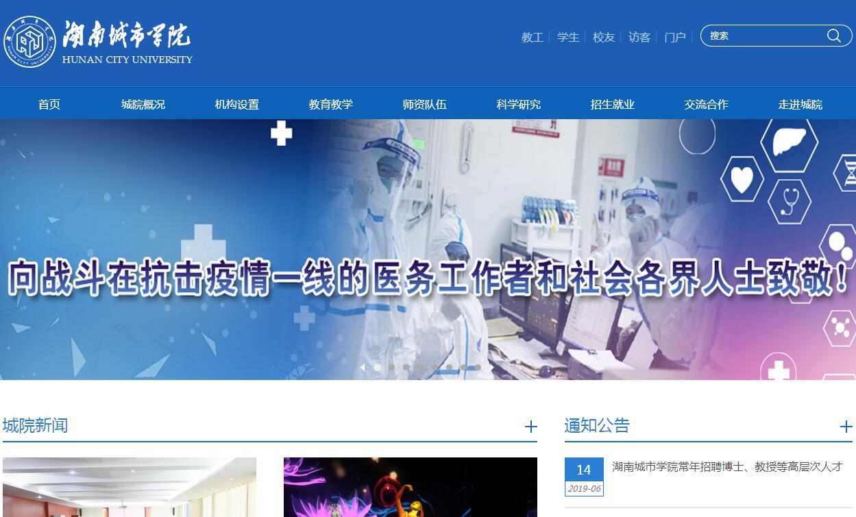 湖南城市学院是一所由湖南省人民政府主办的全日制普通本科院校。学校位于长江中下游平原、洞庭湖南岸环湖生态经济圈核心城市——湖南省益阳市,学校人文底蕴深厚,自然环境优美,交通便捷,距省会长沙中心城区仅55公里。学校前身为1970年创办的益阳地区师范专科学校和1978年创办的益阳基础大学。2002年3月,经教育部批准,当时的益阳师范高等专科学校和湖南城建高等专科学校合并为湖南城市学院,是内陆地区第一所以“城市”命名的全日制公办本科学校。学校遵循“品学兼修,知行统一”的校训精神,努力办人民满意的大学,2012年通过了教育部本科教学工作合格评估,2014年成为“教育部信息化建设试点单位”,是“湖南省文明单位”“湖南省平安高校”。学校现有校园面积1568亩,建筑面积53.4万平方米。拥有固定资产16亿元。纸质图书藏书184万册。设有城建类、信息制造类、管理服务类和基础类等四大类学科群51个本科专业,设有13个二级学院,涵盖理、工、文、管、教、艺、经等多个学科。学校面向31个省、市、自治区招生,现有全日制在校学生17500多人,成人教育学生6500多人。学校现有教职工1214人,其中专任教师960余人,具有高级职称的教师462人,具有硕士、博士学位的教师848人,双师双能型教师455人,教师中有教育部本科教指委委员1人,新世纪优秀人才2人,享受国务院特殊津贴专家11人,省级教学名师4名,省新世纪“121人才工程”人选13人。学校坚持教学中心,注重教学改革,不断提升教学质量。现有国家级实验教学示范中心1个、国家级众创空间1个、国家级特色专业1个、国家级综合改革试点专业1个、教育部产学合作协同育人项目11个;湖南省重点建设学科5个,湖南省普通高等学校重点专业4个,湖南省普通高等学校特色专业6个;湖南省优秀实习教学基地7个,湖南省实践教学示范中心3个,湖南省虚拟仿真实验教学示范中心2个,湖南省大学生创新训练中心2个,湖南省校企合作人才培养示范基地4个,湖南省大学生创新创业教育基地1个,湖南省校企合作基地1个。近年来,累计获国家级教学成果奖3项,省级教学成果奖26项。学校立足建设行业,突出城市主题,产学研用结合,为社会培养了一大批高级应用型人才。学校毕业生就业率连续15年超过95%。在湖南省毕业生毕业五年薪酬排行榜上近年多次位列全省同类院校第一,先后被评为“全国毕业生就业典型经验高校”“湖南省就业创业示范校”。学校被誉为“城建人才的摇篮”,优秀毕业生参与了国家体育场(鸟巢)、秦山核电站、沪昆高铁、杭州湾大桥等国家重点建设项目。学校重视科学研究工作,科研水平快速提升。学校现有国家级众创空间1个,湖南省重点实验室2个,省工程技术研究中心1个,专业特色智库1个,哲学人文社会科学研究基地3个,博士后科研流动站协作研发中心1个,省社科学普及基地1个,省社科重点研究基地1个,省高校重点实验室1个,省高校师德教育研究基地1个,产学研合作示范基地2个,省高校科技创新团队1个,其他省厅级平台4个,是湖南省无障碍建设技术支撑单位。近年来,累计获国家自然科学、社会科学基金项目36项,获教育部、省级科学技术奖和社科基金项目优秀成果奖13项;国家专利申报和获得数量连续3年位居全省高校前列,其中获得发明专利授权72项,出版学术专著119部,被“ESI高被引论文”收录4篇。获国家级、省级行业奖25项,是湖南省规划设计领域获奖等级最高、奖项最多的单位,在城乡规划、生态规划、建筑设计、地理信息系统开发与应用研究等方面处于湖南省先进水平。《湖南城市学院学报》(社会科学版)是“全国百强社科学报”和“湖南省十佳优秀理论资助期刊”,办刊特色明显,国家新闻出版广电总局下文批准更名为《城市学刊》。学校利用学科专业优势,深化产教融合,服务地方经济社会发展,成效显著。学校是首批入驻湖南省大学科技产业园的高校。学校主持制定的《镇(乡)村绿地分类标准》被住建部批准为国家行业标准,编制的“长株潭生态绿心地区空间发展战略规划”获国际招标第一名。省级学会湖南省城市科学研究会落户我校。学科优势催生产业集群发展,学校现有规划建筑设计研究院、监理公司、土木工程检测中心、黑茶研发公司等校办企业,其中规划建筑设计研究院具有6项甲级资质,是“国家高新技术企业”,年产值2亿元。学校注重国际合作与交流,先后与韩国、英国、美国、新西兰、加纳、香港、澳门等国家和地区高校开展密切合作,是“马来西亚高等教育年度优质合作院校”。与新西兰维特利亚理工学院合作举办视觉传达设计专业本科教育项目,与加纳海岸角大学合作举办孔子学院,是湖南省二本院校中的第一所孔子学院。2016年,学校第三次党代会谋划了学校发展新蓝图,确定了“十三五”主要发展目标和任务:一个目标:建设特色鲜明的高水平应用型大学。两个着力点:突出内涵建设和特色发展。三件大事:确保高水平通过教育部本科教学工作审核评估,促成医学类学科并入学校,力争突破硕士点。五大工程:全面实施人才培养提质工程、创新服务引领工程、师资队伍优化工程、学生发展能力提升工程、幸福指数增长工程。在新的起点上,学校聚焦“双一流”,助推内涵建设和转型发展,全面推进以“六破六立”为核心内容的综合改革,提升核心竞争力,为实现“