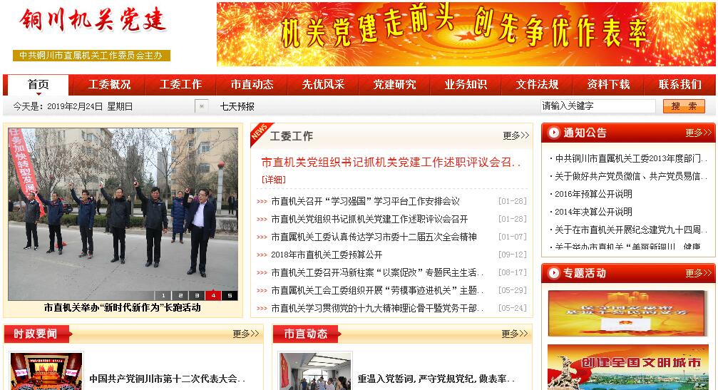 | 网站简介: 铜川机关党建网由中共铜川市直属机关工作委员会主办。其主要职责:1.指导市直机关各级党组织党的思想、组织、作风建设党员管理教育、党建工作理论研究,科级干部的理论培训及入党积极分子的培训工作。2.指导市直机关各级党组织对党员和党员领导干部的监督,了解各部门党员和群众对部门领导干部的意见,向市委反映各部门领导班子和领导干部的情况。3.负责市直机关各部门机关党委(总支、支部)书记、副书记、委员的考核、任免、培训工作。4.领导市直机关各部门机关党委(总支、支部)和纪律检查工作,审议副县级党员干部违反党纪问题,审批科级以下党员干部违反党纪的处理决定。5.指导市直机关各级党组织配合行政领导做好思想政治工作,指导协调市直机关的精神文明建设活动。6、领导市直机关工会工委、共青团工委、妇工委的工作。7.完成市委交办的其他任务。 |