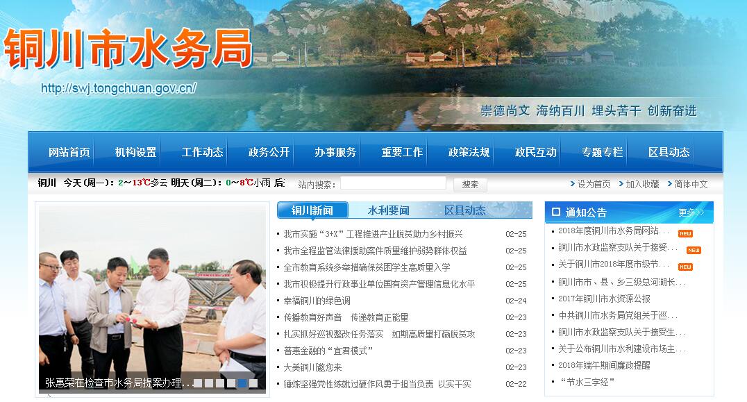 铜川市水务局主要职责:(一)宣传贯彻有关水行政、渔政的法律、法规;拟订水利、水保、防洪、渔业等工作的政策、规范性文件、中长期规划、年度计划,并组织实施。(二)实施水资源的统一监督管理,负责生活、生产经营和生态环境用水的统筹兼顾和保障。组织拟订全市和跨县区水中长期供求计划、水量分配方案并监督实施;组织开展水资源调查评价工作;组织实施取水许可、水资源有偿使用制度和建设项目水资源论证、防洪论证等制度;发布水资源公报。指导水利行业供水工作;指导县及县以下供水管理工作。(三)负责水资源保护工作。组织拟订水资源开发利用与保护规划;组织拟订主要河流的水功能区划并监督实施;会同相关部门实施入河排污口的监督管理工作,核定水域纳污能力,提出限制排污总量的建议;指导饮用水水源保护工作,指导地下水开发利用和城市规划区地下水资源管理保护工作。(四)负责防治水旱灾害,承担市防汛抗旱指挥部日常工作。组织、协调、监督、指挥防汛抗旱工作,对主要河道和重要水库、水电站工程实施防汛抗旱调度和应急水量调度,编制防汛抗旱应急预案并组织实施。承担城市防洪工程建设和管理工作;指导水利突发公共事件的应急管理工作。(五)负责节约用水工作。组织拟订节约用水规划、计划,组织、指导和监督各行业节约用水工作。(六)指导水利设施、水域及岸线的管理与保护;组织、指导河道、水库、滩涂的治理、开发工作;组织建设和管理具有控制性和跨县区重要水利工程;承担水利水电工程移民管理工作。(七)主管水土保持工作。负责水土流失综合治理、预防监督和监测预报工作;按照权限负责开发建设项目水土保持方案的审批、监督实施及水土保持设施的验收工作;指导重点水土保持建设项目的实施。(八)负责农村水利工作。组织协调农田水利基本建设,指导农村水利社会化服务体系建设;按规定指导农村水能资源开发工作,指导水电农村电气化和小水电代燃料工作。(九)负责水行政管理工作,对水利工程建设进行行业监督和管理;编制、审查水利基建项目建议书和可行性报告;组织拟订水利行业技术标准、规程、规范并监督实施;提出有关水价格的建议。(十)负责水政监察和水政、渔政执法工作。负责重大、跨区域涉水违法事件的查处,协调区县、流域和部门之间的水事、渔事纠纷;负责水利行业安全生产工作;组织、指导水库、水电站、大坝的安全监管;指导水利建设市场的监督管理;组织实施水利工程建设的监督。(十一)负责渔业管理工作。负责水产品质量安全监督工作;主管水生野生动物保护工作;负责水产养殖的规划、建设和科技推广。(十二)负责水利科技与教育工作。组织水利科研技术成果的推广和对外经济合作与交流;指导水利队伍建设工作;负责水利信息化和水利统计工作。(十三)承办市政府交办的其他事项。