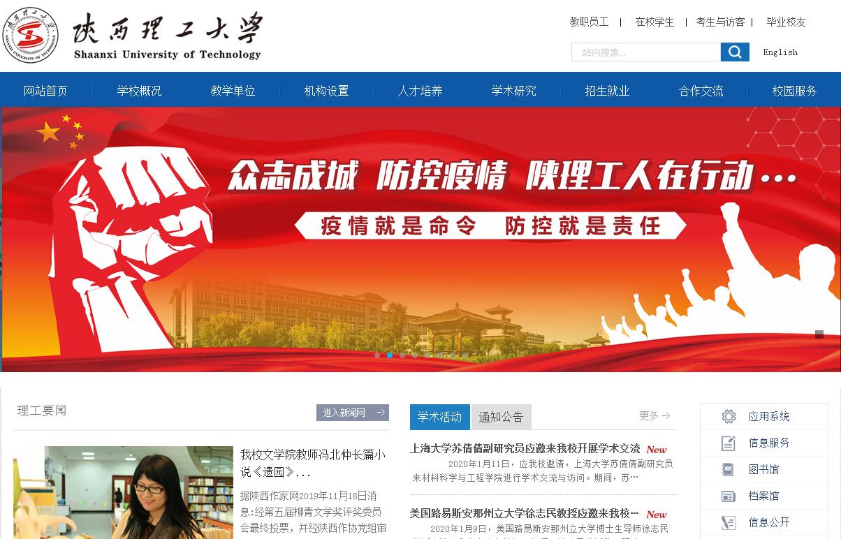 陕西理工大学坐落在中国历史文化名城——汉中市,汉中北倚秦岭、南屏巴山,汉水横贯其间。夏无酷暑,冬无严寒,气候湿润,宜学宜居,素有“汉家发祥地,中华聚宝盆”的美誉。学校创建于1958年,是一所具有60年办学历史的省属普通高等学校,也是全国首批具有学士学位授予权的高校之一,是汉中周边陕甘川鄂渝毗邻地区唯一一所具有硕士授予权的高校。先后经历了汉中大学、汉中师范学院与北京大学汉中分校、陕西工学院、陕西理工学院等发展阶段。2016年经教育部批准,陕西理工学院更名为陕西理工大学。学校现有三个校区,校园总面积136万平方米,校舍建筑总面积68万平方米。现设有17个学院和2个教学实验实训中心。设有65个本科专业。拥有中国语言文学、机械工程、生物学、化学、马克思主义理论、食品科学与工程、材料科学与工程7个一级学科硕士授权点,6个硕士专业学位授权点。学校现有6个省级重点学科(特色学科),1个国家地方联合工程实验室、1个全国人文社会科学普及基地、1个省级2011协同创新中心、3个省级重点实验室、1个省级高校哲学社会科学重点研究基地、1个省级博士后创新基地、1个省级院士专家工作站,拥有14个省级研究中心和服务平台。教学科研仪器设备总值3.41亿元。学校馆藏图书223.53万册。学校现有专任教师1182人。专任教师中具有硕士及以上学位912人,其中具有博士学位255人;具有高级专业技术职务451人,其中教授124人。现有双聘院士3人,国家高端外国专家1人,长江学者特聘教授2人(双聘),陕西省“百人计划”人才8人,陕西省“千人计划”人才1人,“三五人才工程”入选者2人,享受“三秦人才”津贴14人;学校有国务院特殊津贴获得者,全国优秀教师,曾宪梓教育基金、宝钢优秀教师奖获得者,陕西省先进工作者、优秀教师、教学名师、师德标兵、青年科技新星等荣誉称号获得者40余人。全校共有全日制在校生近2万人。建校以来,陕西理工大学始终坚持全面贯彻党的教育方针,坚持依法治校和从严治教,不断深化改革,强化管理,加强教学基本建设,教学质量稳步提高。特别是近年来,学校凝练办学指导思想,大力实施“教学质量工程”,形成了“扎根秦巴,艰苦创业,服务基层,培养下得去、留得住、干得好的高级应用型人才”的人才培养特色,人才培养质量稳步提高,办学实力显著增强。2007年在教育部组织的本科教学工作水平评估中被评为优秀。现拥有2个国家级特色专业,1个国家级和6个省级专业综合改革试点建设项目,6个省级特色专业,3个省级名牌专业,15门省级精品课程,2门省级在线课程,7个省级实验教学示范中心,1个省级虚拟仿真实验教学中心,7个省级人才培养模式创新实验区,10个省级教学团队,8名省级教学名师,2个省级创新创业教育试点学院,10个省级一流专业(其中3个建设项目,7个培育项目),1个国家级和3个省级大学生校外实践教育基地。建校60年来,学校累计为国家培养了10余万名专业技术人才,其中绝大多数已经成为所在行业、部门或地区的业务骨干、学术带头人和优秀管理人才,受到社会各界的广泛好评。学校高度重视科学研究与学术交流,始终坚持基础研究与应用研究并重,坚持面向地方经济建设主战场,学科建设和科学研究工作蓬勃发展,建成了学科门类较为完备的学科体系。在学科建设中,学校不断凝炼学科方向、整合学科队伍、合理配置资源、促进交叉融合,逐渐形成了以秦巴山区自然资源研究与开发利用为特色的理学学科群、以工业应用技术开发研究为特色的工学学科群、以汉水流域文化史及文化产业发展战略研究为特色的人文社会科学学科群及其研究方向,建成了一批具有鲜明特色的学科及研究与服务平台,取得了一系列重要研究成果。“十二五”以来,学校先后承担国家级科研项目120项,省部级科研项目293项,发表学术论文9068篇,其中被SCI等四大索引收录876篇,出版著作和教材559部,获得授权国家专利1991项;获省部级及以上科研成果奖56项;获省级重点科技创新团队1个。《陕西理工大学学报(社会科学版)》为“全国高校优秀社科期刊”,《陕西理工大学学报(自然科学版)》为“中国科技论文在线优秀期刊”。近年来,学校以“人才队伍建设工程”为抓手,大力引进“百人计划”和国家高端外国专家等高水平人才,积极聘请院士、教育部“长江学者”等知名专家、教授为学校双聘教授,同时启动“千万工程”,大力引进和培养博士,不断提升人才队伍水平。学校重视国际学术与文化交流。先后与美国、澳大利亚、德国、新西兰、波兰、韩国、日本等国家和地区的20余所高校及教育教学组织建立并保持合作与交流关系,积极拓展与“一带一路”沿线国家高校的合作与交流。常年聘请外籍专家及国内外知名学者来校任教、讲学,促进学校的学术交流与对外融合。积极发展留学生教育。一代代陕理工人的传承奋进铸就了“艰苦奋斗、忠诚奉献、求真尚实、博望致远”的陕西理工大学精神。当前,学校以创新、协调、绿色、开放、共享发展理念为引领,深入实施学科建设与科技创新工程、教学质量提升工程、人才队伍建设工程、大学文化建设工程、党的建设工程,深化改革,强化管理,全面开展创建以工程教育和教师教育为主、多学科协调发展、特色鲜明的高水平应用型大学,努力实现学校事业发展的新突破。