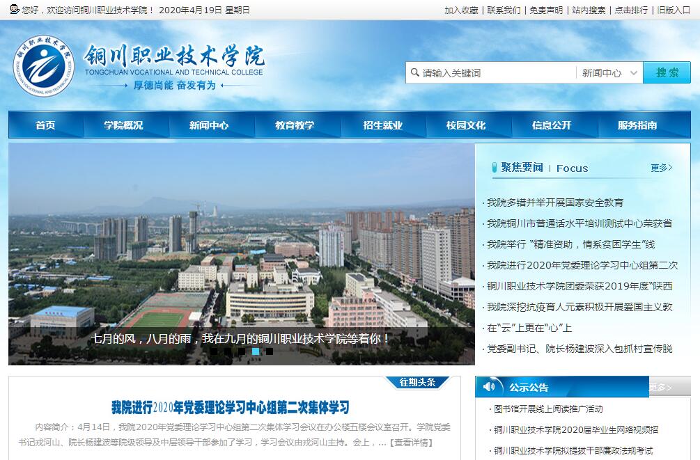 铜川职业技术学院是经陕西省人民政府批准、国家教育部备案的全日制公办高等职业院校。行政隶属铜川市人民政府,上级业务主管部门是陕西省教育厅。学院现有新区、虎头山、黄堡三个校区,其中新区校区地处铜川市新区朝阳路西段。现有馆藏纸质图书36.65万册;建有校内专业实验实训室71个,校外实习基地87个。校内建成机械制造、电工电子与自动化、建筑工程技术、材料工程、护理、人文科学和计算机等7个实训中心,教学仪器设备总值3600余万元,实践教学用房总面积21700平方米。建院以来,学院各项事业取得了长足发展,已为社会培养了8000多名各类技术技能人才。学院现设师范教育与管理学院、机电工程学院、建筑与材料工程学院、孙思邈医学院、继续教育学院、基础部、培训部7个教学单位和12个党政群机构。现有教职工298人,其中专任教师188人,具有研究生学位的教师35人,具有高级职称教师38人。目前学院面向四川、重庆、河南、山西、青海、内蒙、宁夏等9省市招生,现已初步形成了人文、机电、建工、医学四个专业群,专业设置及学生人数逐年增加。开设三年制高职专业30个,五年制高职专业14个,其中,央财支持提升专业服务产业发展能力建设项目1个,省级专业综合改革试点项目2个;建成省级重点专业5个,6个院级重点专业;央财支持建设实训基地1个,省级示范性实训基地3个;建成省级精品课程1门,院级精品课程 18 门。建成职业技能鉴定考试站9个、省市级人才培养基地5个、培训中心3个,被确定为陕西省“人人技能工程”实施院校。学院有全日制在校生学生近4000人,成人教育在校学生5000人,年岗位培训各类人员近万人。铜川职业技术学院以服务发展为宗旨,以促进就业为导向,以专业建设为重点,建章立制,不断改善办学条件,加强内涵建设,办学水平、人才培养质量不断提高。先后于2010年12月顺利通过教育部高等职业院校人才培养工作评估、2011年9月通过了陕西省人民政府高职院校办学情况督导、2015年11月接受省教育厅专家组的巡视诊断。学院立足陕西,辐射西北,正在为建设特色鲜明、省级示范性高职院校而努力奋斗!
