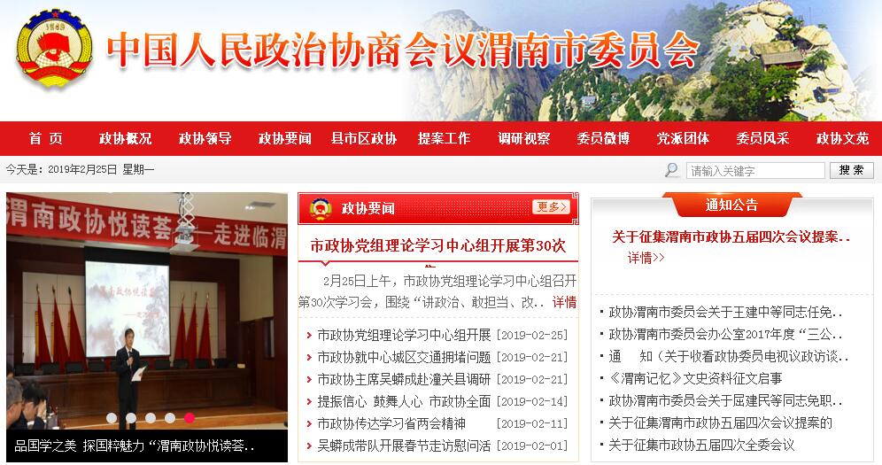 | 网站简介: 渭南市政协成立于 1995 年5 月,其前身为政协陕西省委员会渭南地区工作委员会。市政协于2016年2月换届,现为第五届。主席、副主席共8人,其中:中共4人,非中共4人(民盟1人、民建1人、农工党1人、工商联1人);秘书长1人,副秘书长4人;常委55人,其中:中共18人,非中共37人。本届政协共设27个届别,委员439人,其中:中共 180 人,占41% ;民主党派、无党派人士和各方面非中共代表人士共259人,占59% 。市政协设:提案委员会、经济委员会、人口资源环境委员会、科教文卫体委员会、社会法制和民族宗教委员会、文史和学习委员会、委员工作委员会七个专门委员会及办公室、综合处等9个县级机构。办公室下设人秘科、行政科、老干科、机关服务中心;综合处下设宣传信息科、综合科。机关共有干部职工 47 人。 |