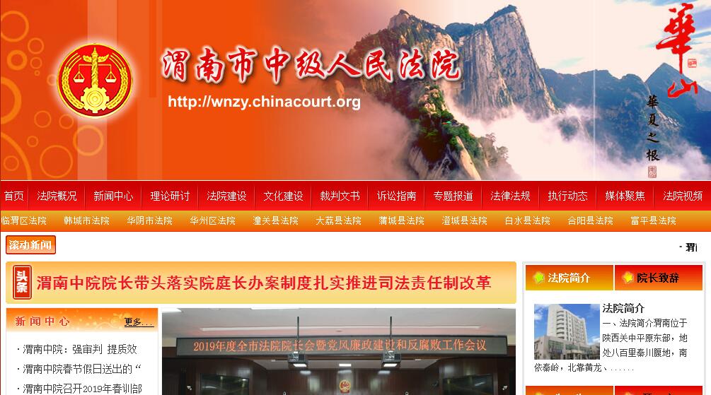 渭南位于陕西关中平原东部,地处八百里秦川腹地,南依秦岭,北靠黄龙、乔山山脉,东邻山西、河南两省,西与西安、咸阳、铜川三市接壤。渭南面积13134平方公里,总人口540余万,市区面积90平方公里,城镇人口190万,现辖一区、两市、八县。自古以来,渭南既是物华天宝,地杰人灵之地,又处京畿要塞,素有“三秦要道,八省通衢”之称,有着古老的文化和悠久的历史。随着共和国的诞生,渭南获得新生,随之而来的即是渭南法院的设立。风雨数十年,渭南法院几经磨难,依然坚强。改革开放,特别是九五年撤地设市以来,渭南发生了天翻地覆的变化,渭南法院也蓬勃发展起来,并取得了显著的成绩。渭南辖区设有1个中级人民法院和11个基层人民法院、54个人民法庭。全市法院共有1239人,其中审判人员688人,司法行政人员135人,法警99人,书记员286人,工勤人员31人,年审(执)结案件2万件左右。市中院内设28个部门,法官干警203人,其中审判人员127人,司法行政人员30人,法警10人,书记员16人,工勤人员20人,年审(执)结案件2000件左右。渭南市中级人民法院综合审判大楼地处渭南高新技术开发区,于2002年10月28日动工兴建,2003年5月1日正式落成。综合审判大楼共10层总建筑面积8516平方米,1至2层为审判法庭,设大、小法庭6个,立案大厅1个,3至10层为办公区,内设办公室110个,会议室3个。并配置有先进的报警系统,自动化系统和摄像监控系统。建筑风格别致,庄严雄伟。现设有刑一庭、刑二庭、民一庭、民二庭、民三庭、行政庭、立案庭、审监庭、执行局、赔偿办、司法技术、审判管理中心、政治部、办公室、研究室、监察室、法警支队、新闻中心、工会和法官培训中心等部门。近年来,渭南市中级人民法院坚持以党的十八届三中、四中全会和习近平总书记系列重要讲话精神为指导,坚持“公正司法、司法为民”主线,全面履行宪法法律赋予的职责,努力让人民群众在每一个司法案件中都感受到公平正义,为推进渭南经济发展、社会和谐稳定提供了有力的司法保障!面对形势发展的新需求和人民群众的新期盼,人民法院承担的任务繁重而艰巨,肩负的责任重大而光荣。我们将认真贯彻落实党的十八届三中、四中全会精神,以“四个全面”战略布局为指引,发扬成绩,团结拼博,为平安渭南、法治渭南建设而努力奋斗。