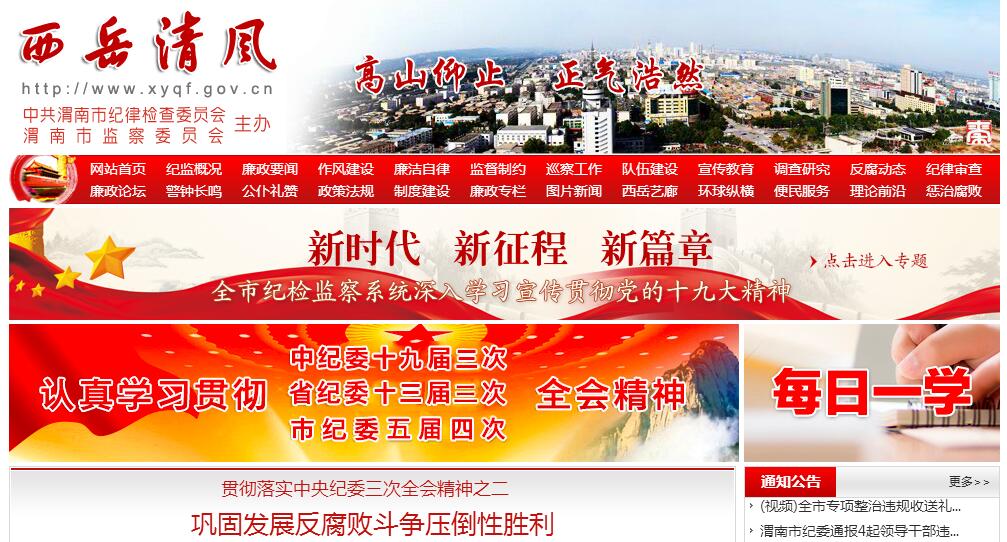 | 网站简介: 西岳清风网由中共渭南市纪律检查委员会,渭南市监察委员会主办。渭南市监察委员会是由渭南市人民代表大会选举产生,并向渭南市人民代表大会常务委员会和陕西省监察委员会负责,并接受其监督的国家监察机关。2017年12月20日,渭南市监察委员会正式挂牌。这标志着我市深入贯彻落实党的十九大精神、全面推进国家监察体制改革试点工作又迈出了关键性的一步。监察机关依法行使监察权,主要职能是:(一)维护宪法和法律法规;(二)依法监察公职人员行使公权力的情况,调查职务违法和职务犯罪;(三)开展廉政建设和反腐败工作。监察机关的职责是监督、调查、处置。 |