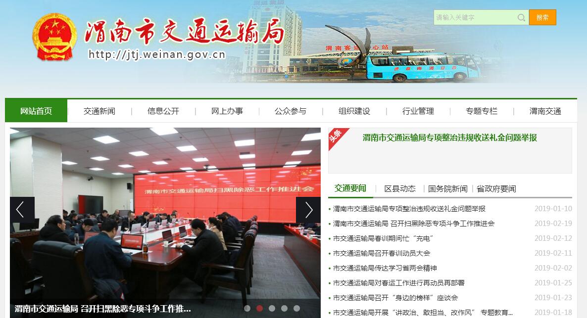 渭南市交通运输局主要职责:(一)贯彻执行国家有关交通运输法律、法规,拟定全市公路、水路交通发展规划。负责综合交通运输体系的规划协调,促进各种运输方式协调发展。指导交通运输行业体制改革,推动行业协调发展。(二)统筹安排全市公路、水路交通运输发展规模、速度和比例,制定交通固定资产投资、运输年度计划,并监督实施。负责公路、水路交通科研成果的审查。(三)负责全市公路和水路交通运输、城乡客运、城市公交、出租汽车的行业市场管理,维护公路、水路交通运输行业的平等竞争秩序,协调公路、铁路、民航、水路运输经济活动,做好相互衔接工作。按规定负责物流市场有关工作。(四)负责全市境内公路(国、省、县、乡、村道)及其设施的建设管理和养护管理。组织实施重点公路建设工程。(五)负责公路、水路交通基础设施建设市场监管,制定市场规划,发布市场信息,监督市场行为,为交通运输行业发展提供服务。(六)承担全市水上交通安全监管责任。指导公路、水路行业安全生产和应急管理工作,按规定组织协调重点物资和紧急客货运输。负责船舶及相关水上设施的管理工作。负责船员管理有关工作。依法组织或参与事故调查处理工作。承担国防动员有关工作。(七)负责公路、水路交通工程质量与计量工作的管理和监督,会同有关部门拟订公路、水路投资、价格及其他有关经济政策。(八)指导交通运输信息化建设,监测分析运行情况,开展相关统计工作,发布相关信息。指导公路、水路行业环境保护和节能减排工作。负责全市交通行业的统计工作。(九)依据政府公布的部门“权力清单”和“责任清单”,依法行使行政职权,承担行政职责。(十)承办市政府交办的其它事项。