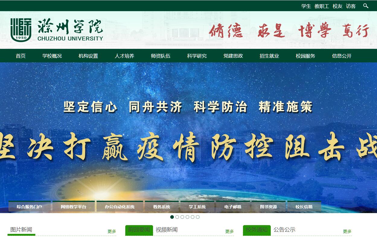 滁州学院位于皖东江淮之间,学校所在地滁州市,素有“金陵锁钥、江淮保障”之称,与江苏省南京市山水相连,山清水秀,文化底蕴浓厚,北宋欧阳修留下千古名篇《醉翁亭记》;朱元璋从这里开始创建了大明王朝;清代吴敬梓创作了开讽刺小说之先河的皇皇巨著《儒林外史》;下辖的凤阳县小岗村是中国农村改革的发源地。学校是一所以工、管为主,工、管、文、理、经、教、农、艺八大学科门类协调发展的多科性、应用型本科院校,是“全国文明单位”“全国绿化模范单位”“全国创新创业典型经验高校”“全国深化创新创业教育改革示范高校”“安徽省地方应用型高水平大学建设学校”。学校前身是创建于1950年的滁州师范学校。历经滁县师范学校、安徽师范大学滁县教学点(分校)办学阶段;1980年更名为滁州师范专科学校;2004年5月升格为滁州学院。2017年顺利通过教育部本科教学工作审核评估。学校占地面积108.9万平方米,现有会峰、琅琊两个校区,校舍建筑面积46万平方米,教学仪器设备值2.6亿元,馆藏纸质图书119.8万册。设有17个二级学院,62个本科专业。现有教职工1150人,其中正高级职称88人、副高级职称240人,博士251人(含在读78人)、硕士727人。全日制在校本科生17867人。在多年的办学实践中,学校秉承“思变尚新、务实求真”的精神,大力弘扬“爱国荣校、尊学敬道”的优良校风,深入践行“修德、求是、博学、笃行”的校训精神,探索一条“由师范专科向多科性应用型本科转变”的发展之路。党建和思政工作呈现新气象。坚持立德树人中心环节,加强党委对学校工作的全面领导,坚持社会主义办学方向,忠诚履行管党治党、办学治校主体责任。全面贯彻落实全国全省高校思想政治工作会议精神,强化实践育人,注重文化育人,落实关爱育人,推进网络育人,校园文化氛围浓郁,文明创建工作取得实效。荣获安徽省党建和思想政治工作先进高校、安徽省教育系统关心下一代工作先进集体等称号,涌现出“中国大学生自强之星”“感动中国候选人物”“全国乡村道德模范”“安徽省辅导员年度人物”等先进典型。2015、2016、2017年学校领导班子在安徽省委党建和发展综合考核中连续获得“优秀”等次。学科专业建设取得新成效。围绕地方支柱产业和战略新兴产业,通过新建、调整和改造,优化专业布局,培植应用型专业生长点,打造学科专业特色。学科专业转型被教育部评估中心推介为转型发展典型案例。“单一师专升本院校应用型学科专业调整建设路径的探索与实践”获得安徽省教学成果一等奖。地理信息科学、网络工程、物联网工程、食品质量与安全等四个应用型专业被艾瑞深研究院列为中国高水平专业。拥有省级产业创新团队1个、省级科技创新平台7个,地理学获批安徽省“双一流”建设国内一流学科(B类)。获国家科技进步二等奖1项、省(部)级科技成果奖5项。1名教师入选“2014年中国高被引学者”名单。人才培养质量有了新提高。坚持以人才培养为中心,围绕应用型人才应具备的知识、能力、素质,探索“转型为基、实践为要、双创为核”人才培养模式,深化“五位一体”教育教学改革,形成“一线贯穿、三点发力”的创新创业教育特色。“地方应用型高校‘三个课堂一体,三个平台联动’实践育人模式的构建与探索”获得安徽省教学成果特等奖。建有实验室和实训中心19个,其中省级示范实验实训中心6个、虚拟仿真实验教学中心2个、大学生创客实验室8个;校外实习实训基地240个。2014年以来,获批省级以上质量工程项目167项、省部级教学成果奖12项。获批国家级大学生创新创业训练计划项目169项,位列全国同类院校第18位。在各类学科竞赛和创新创业类比赛中,获国家级奖130项、省级奖930项。获国家授权专利91项。获批“国家级大学生创新创业训练计划实施高校”“安徽省A级大学生创业孵化基地”。《人民日报》官微发布2015全国高校毕业生平均薪酬百强榜,我校位列全国高校第92位。第三方评估报告显示,近三届毕业生对学校满意度总体较好,各项调查结果均高于全国非“211”本科院校平均水平。学校荣获安徽省就业工作先进集体。师资队伍建设得到新提升。大力引进和培育高层次人才,推进“博士化”工程,不断改善师资队伍结构,有效支撑学科建设。实施“双百”“双证”“青蓝”计划,提升教师“双能”素质。2014年以来,引进中组部“千人计划”人才领衔团队1个,获批安徽省“115”产业创新团队、高校领军人才团队、省委组织部和省人才办Ⅱ类引才平台各1个。引进国家级人才5人;新增教授40人,引进和培养博士85人,专任教师博士率位居安徽省同类高校前列。认定“双能型”教师402人。1名教授作为全国基层科技工作者代表,应邀出席全国两院院士大会。学校高质量完成全国宅基地制度改革试点“金寨县农村宅基地调查和利用技术服务项目”,得到了国土资源部的充分肯定,教师的能力和水平得到彰显。科研和社会服务能力迈上新台阶。深化与滁州市人民政府战略合作,与多个县(市、区)签订合作协议。与康佳集团、全柴集团等国有大中型企业开展深度合作。与企业共建省级工程技术研究中心2个、市级工程技术研究中心8个。2014年以来,新增省(部)级以上科研课题180项。获批国家专利329项,其中国家发明专利33项,3项发明专利实现