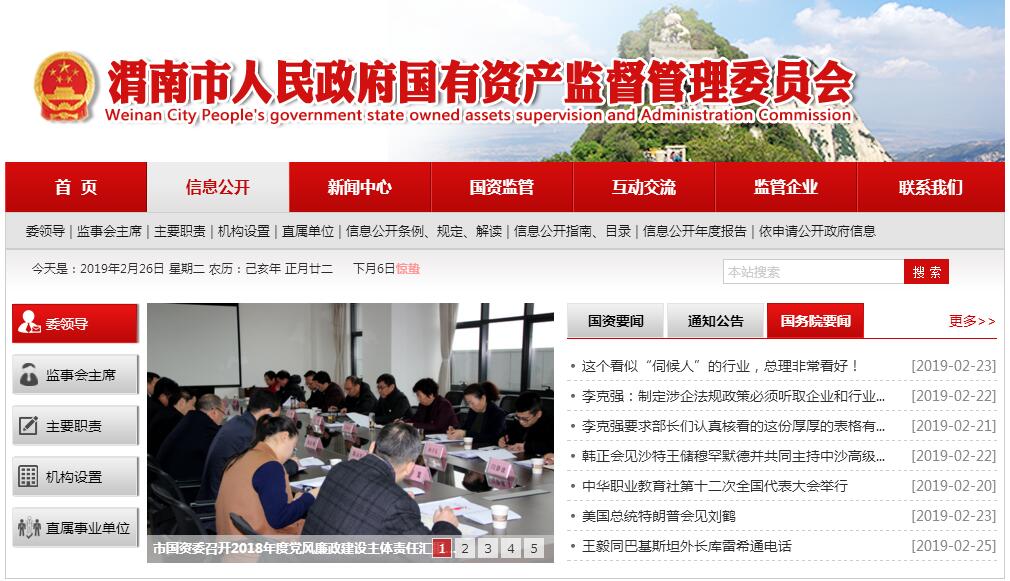 渭南市人民政府国有资产监督管理委员会主要职责:(一)根据市政府授权,依照《中华人民共和国公司法》、《中华人民共和国企业国有资产法》等法律和行政法规履行出资人职责,监管市属企业的国有资产,加强国有资产的管理工作。(二)承担监督所监管企业国有资产保值增值的责任。建立和完善国有资产保值增值体系,制订考核标准,通过统计、稽核对所监管企业国有资产的保值增值情况进行监管,负责所监管企业工资分配管理工作,制定所监管企业负责人收入分配政策并组织实施。(三)指导推进国有企业改革和重组,推进国有企业的现代企业制度建设,完善公司治理结构,推动国有经济布局和结构的战略性调整。(四)通过法定程序对所监管企业负责人进行任免、考核并根据其经营业绩进行奖惩,建立符合社会主义市场经济体制和现代企业制度要求的选人、用人机制,完善经营者激励和约束制度。(五)按照有关规定,代表市政府向所监管企业派出监事会,负责监事会的日常管理工作。(六)负责组织所监管企业上交国有资本收益,参与制定国有资本经营预算有关管理制度和办法,按照有关规定负责国有资本经营预决算和执行等工作。(七)按照出资人职责,负责督促检查所监管企业贯彻落实国家安全生产方针政策及有关法律法规、标准等工作。(八)负责企业国有资产基础管理,起草国有资产管理地方性法规、政府规章草案,依法对县级国有资产管理工作进行指导和监督。(九)承办市委、市政府交办的其他事项。