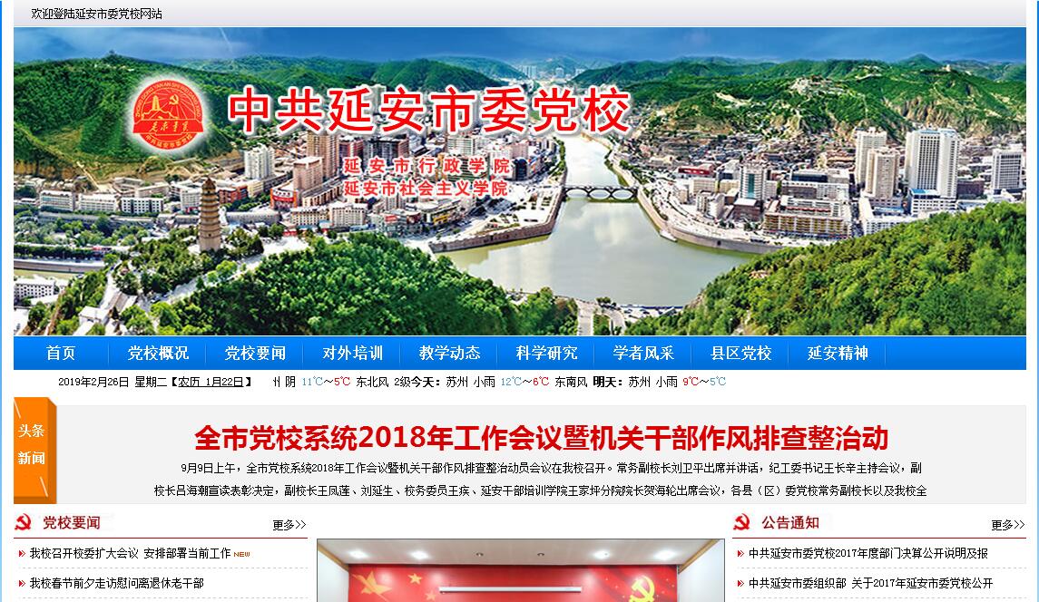 中共延安市委党校,前身是陕北区委党校和延属地干班, 1943年创办。1948年1月,延属地委决定,延属地干班与行知中学合并,成立延属分区党校,6月和西北局党校合并,附设延属干部训练班。1949年10月,在干训班基础上创建中共陕北区委党校,1950年更名为延安地方党校,1954年又更名为中共延安地委党校,1997年1月延安撤地设市后更名为中共延安市委党校。现坐落在延安市王家坪原“中共中央党校二部”和“中国女子大学”旧址。70多年来,我校为中国革命和建设尤其为延安培养了大批优秀人才,同时也得到了党和国家领导人的特殊关怀,历史上我校有部分领导和学者曾受到过毛泽东、周恩来、邓小平、江泽民、胡锦涛、王震的亲切接见,彭真、习仲勋、马文瑞、李建国等也曾先后题词。1985年经陕西省委批准为大专体制。1994年以来相继兼办延安行政学院、延安社会主义学院,2012年11月,市委批准加挂延安干部培训学院王家坪分院牌子,实行四块牌子一套人员管理体制。下设办公室、教务处、科研处、总务处、机关党委、监察室、图书馆等七个党政群管理部门,马列基础理论、经济学、法学、党史党建、中文历史科技、管理学等六个教研室和延安精神研究中心。市编委核准编制112人,现有教职工102人。经过多年建设,现有综合教学楼一幢、图书办公楼一幢、、大礼堂、学员餐厅、老干部活动中心等,总建筑面积达33300平方米,基础设施已能基本满足全市干部培训和对外培训的需求。 近三年来,我校在市委、市政府的坚强领导下,在新一届校委班子的带领下,在全校教职工的共同努力下,紧紧围绕建设“四个基地”、争创全国一流市级党校的奋斗目标,坚持质量立校、人才强校、从严治校和制度管校原则,开拓创新,扎实工作,教学、科研等工作取得了新的成绩。三年多来,我们按照中央确立的“一个中心,四个方面的”教学布局和“教学出题目、科研做文章、成果进课堂”的要求,不断创新教学内容和教学方式,教学质量明显提高。三年来,共举办计划内各类培训班96期,培训干部7600人;面向全国举办延安精神和革命传统教育培训班607期,培训人数33386人;举办专业技术人员和公务员培训班22期,培训3055人;积极组织教师深入县(区)、部门和企业进行十八大精神、十八届三中全会、四中全会和习近平总书记系列讲话精神社会宣讲280余场,培训60860多人次。同时,紧紧围绕市委、市政府的中心工作,加强对理论和现实问题的研究。三年来共完成科研成果221项,超任务195项。先后荣获省委党校系统理论研讨优秀论文一等奖9篇,二等奖9篇,三等奖16篇。课题立项5项(省级课题1项),向市委上报《送阅件》2期。同时,组织教师编写系列教材,截至目前已完成了《延安时期的党群干群关系》、《张云泉群众信访案例解析》两本书的出版和《延安时期著名人物》、《延安革命旧址》两本书的通稿定稿工作。