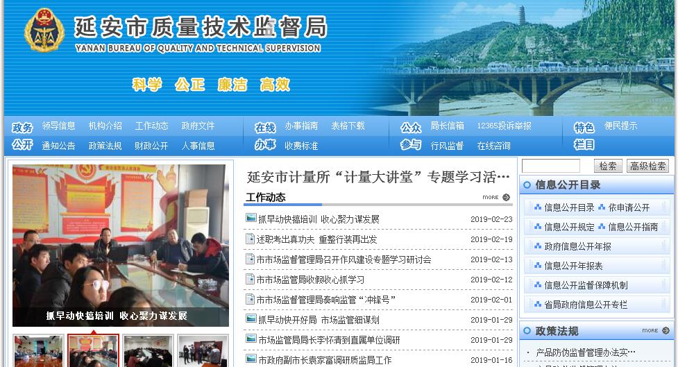 延安市质量技术监督局主要职责:(一)、贯彻执行国家、省质量技术监督法律、法规和方针、政策,负责与质量技术监督技术规范工作。(二)、负责全市产品质量诚信体系建设和质量宏观管理工作,实施国家质量发展纲要,推进名牌发展战略;会同有关部门实施重大工程设备质量监理,参与重大产品质量事故调查;实施缺陷产品召回制度,监督管理产品防伪工作。(三)、负责产品质量安全监督工作,管理产品质量安全强制检验、风险监控、监督抽查、地理标志产品保护工作;负责工业产品生产许可证管理,开展产品质量安全专项整治工作,查处产品质量违法行为,打击假冒伪劣违法活动,组织全市有关专项打假活动。 (四)、统一管理全市标准化工作,贯彻执行国家标准和行业标准,对标准的实施进行监督检查;组织制定、修订、审批、发布市级推荐性农业地方标准规范,管理企业标准备案、标准登记;负责管理采用国际标准和国外先进标准工作,监督标准的贯彻执行,管理全市组织机构代码和商品条码工作。(五)、统一管理计量工作,推行法定计量单位和国家计量制度;组织实施量值传递和强制检定以及计量校准工作,负责规范和监督全市商品量和市场计量行为。(六)、统一管理和监督认证认可工作,监督和规范认证市场,对为社会出具公正数据的技术机构实施监督管理。(七)、承担综合管理特种设备安全监察、监督工作的责任,监督管理高耗能特种设备节能工作。(八)、组织实施质量技术监督科技发展和技术机构建设规划。(九)、承办市政府交办的其他事项。